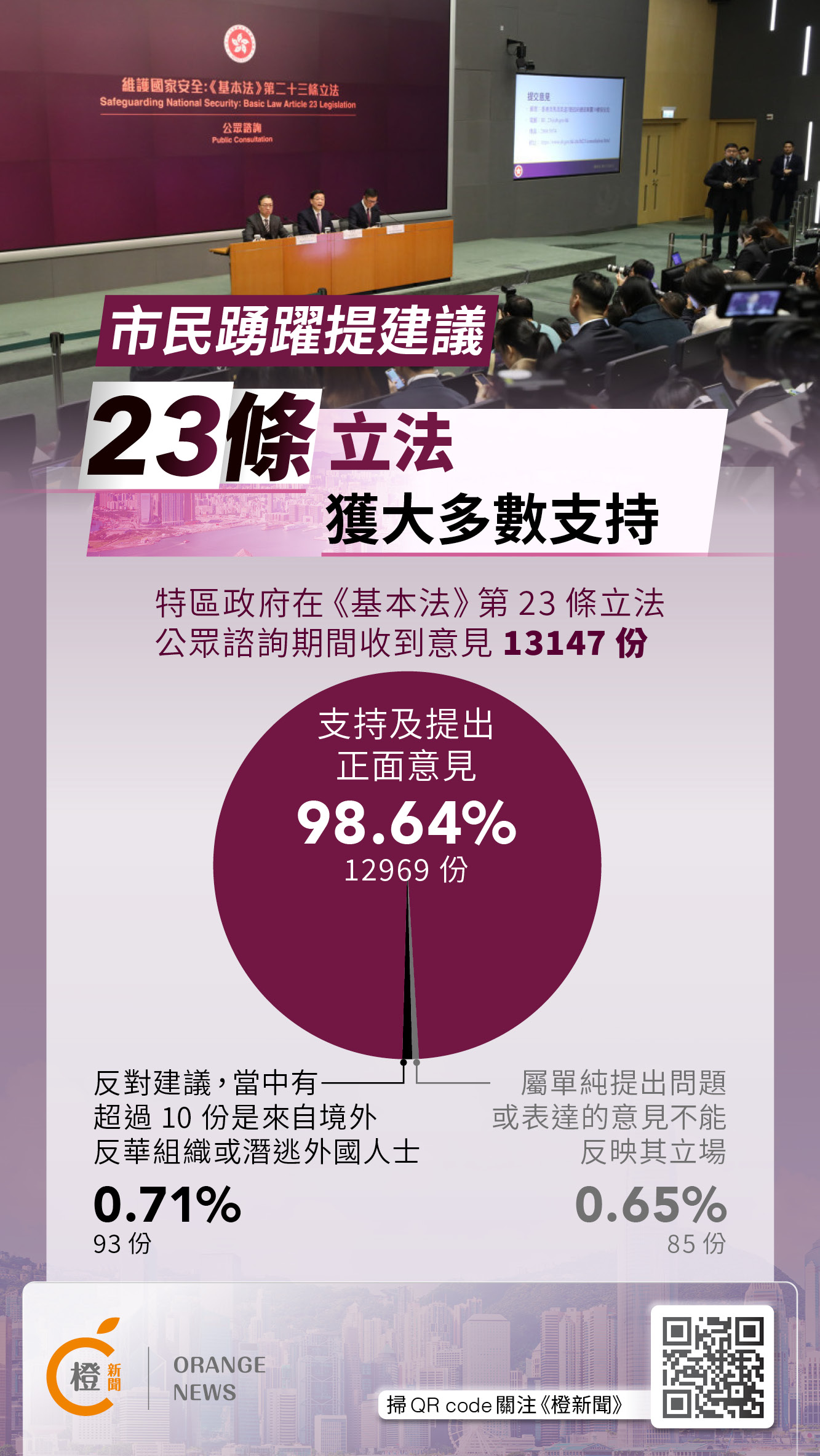 【橙訊】保安局於1月30日就基本法第23條立法開展的公眾諮詢,於昨日(28日)結束。特區政府表示,公眾諮詢期間一共收到13,147份意見,其中98.64%提出正面意見。
