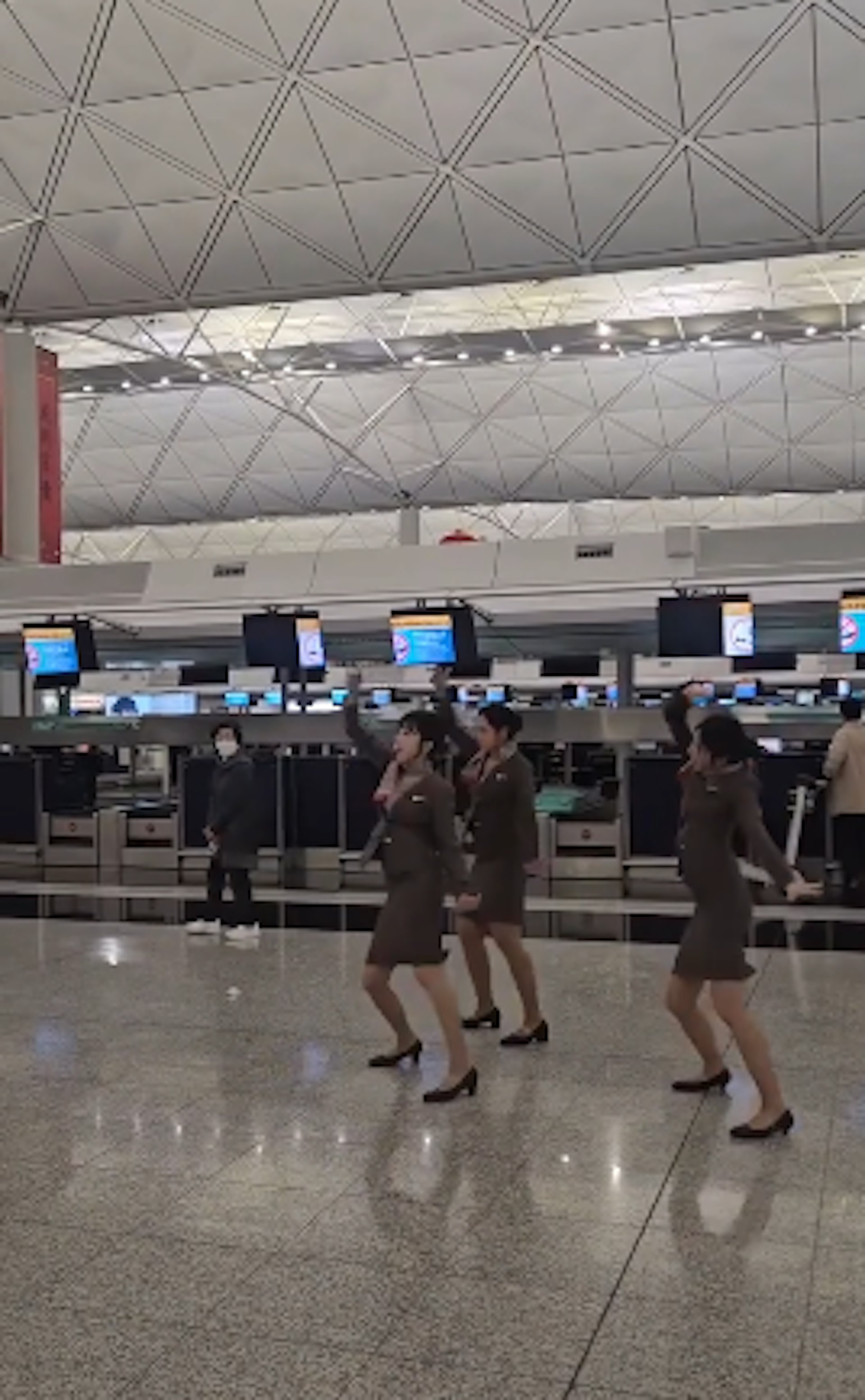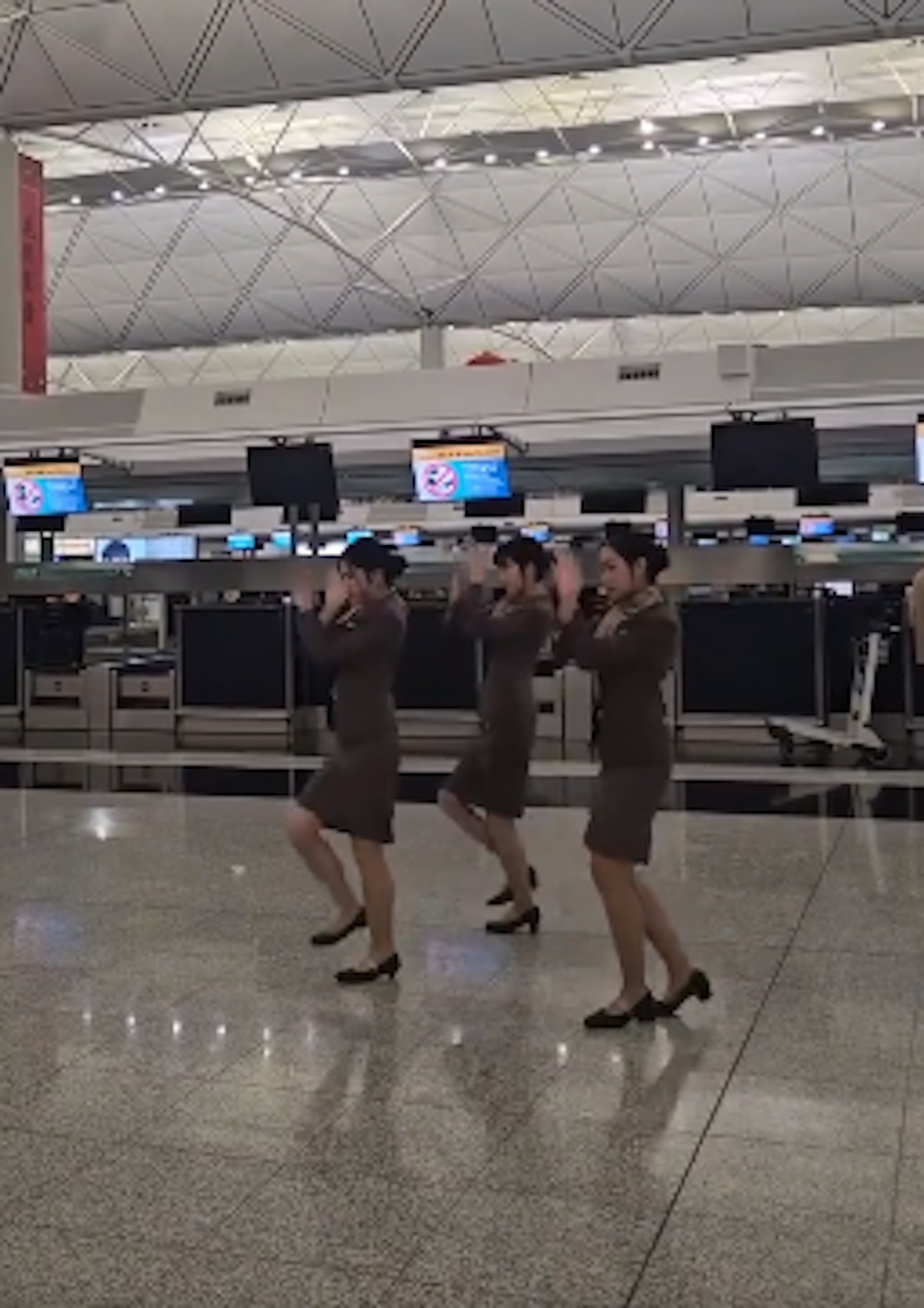 【橙訊】韓流席捲全球,當中女團跳舞挑戰短片更是一直受粉絲追捧,近日網上亦瘋傳一段空姐在香港國際機場熱舞影片。從影片可見3名身穿制服的空姐,在機場的離境大堂櫃位前熱舞,伴隨節拍強勁的歌曲,有網民認出是韓亞航空的空姐。而該段30秒的影片引來不少網民熱議,指她們表現專業,笑言「跳得咁好,係咪dancer扮空姐跳」。
