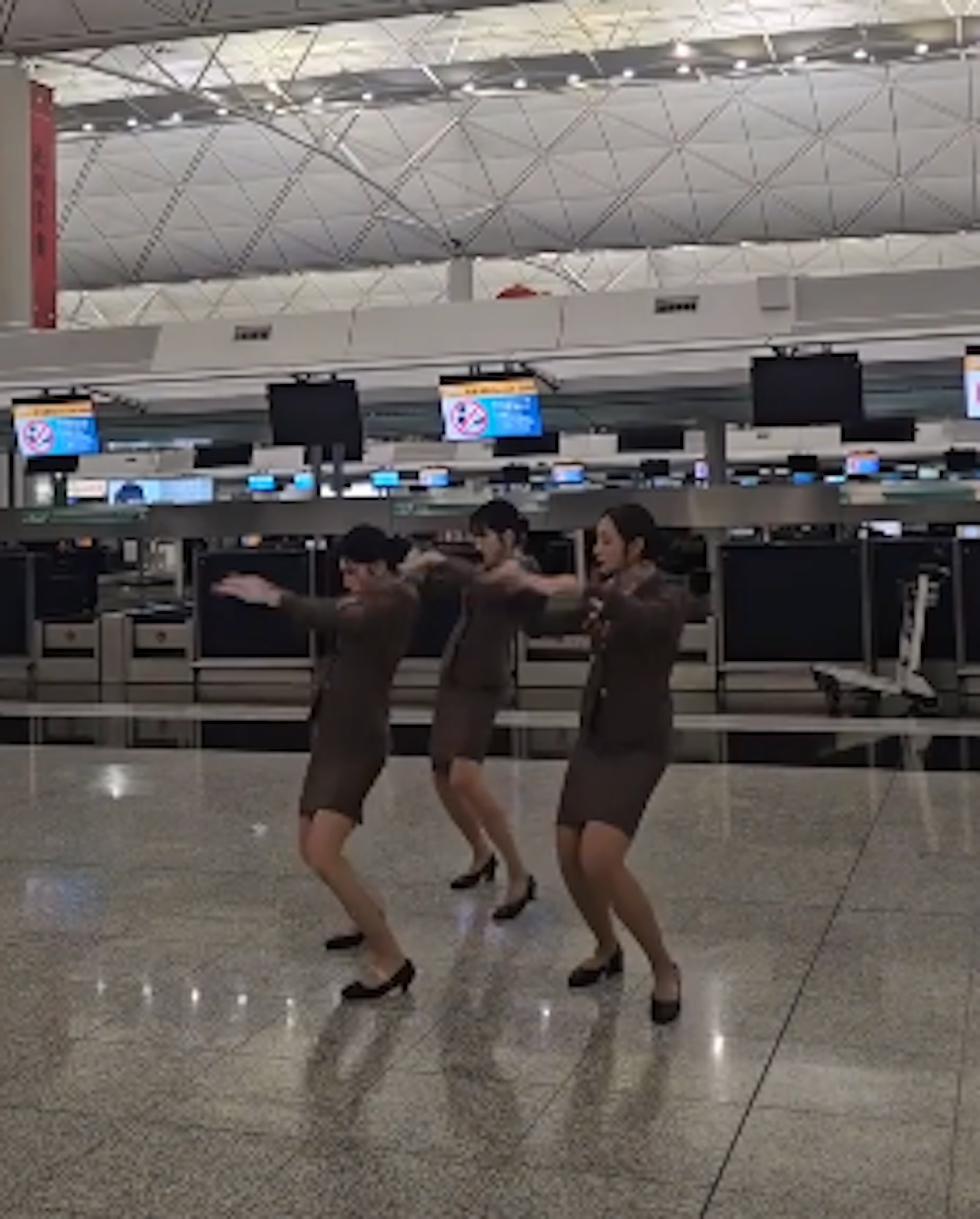 影片中,3位身穿韓亞航空制服的女子,在香港機場離境大堂的航空公司櫃台前,伴隨強勁的歌曲節拍熱舞(圖:flyasiana_hkg@IG)
