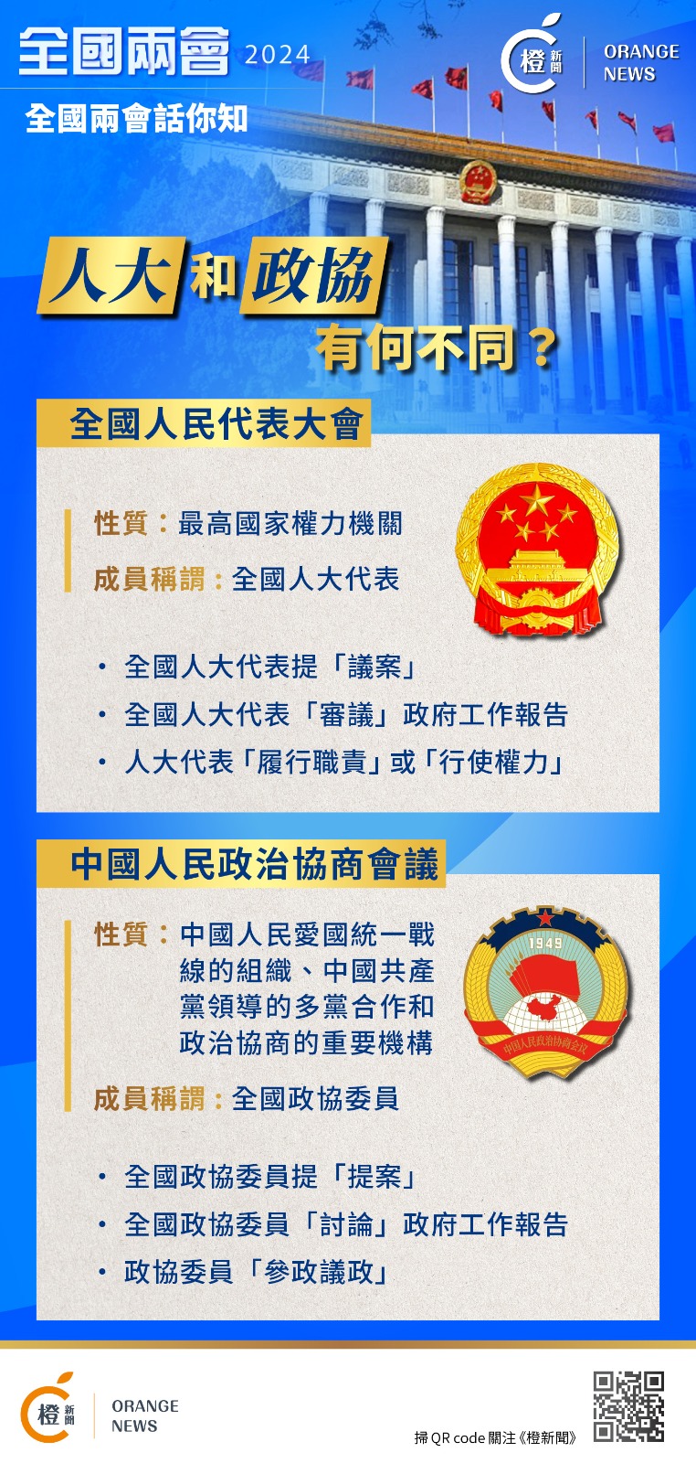 【橙訊】全國人民代表大會和中國人民政治協商會議,通常在每年3月初基本同期召開,故兩者常合稱並簡稱為「 全國兩會 」。兩者性質及成員職責均不同。
