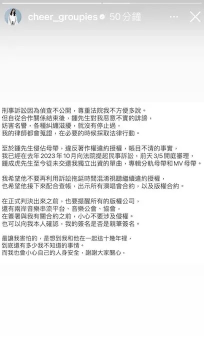 陳綺貞在社交平台發文,指不排除會在必要的時候對鍾成虎採取法律行動。(圖:@cheer_groupies)