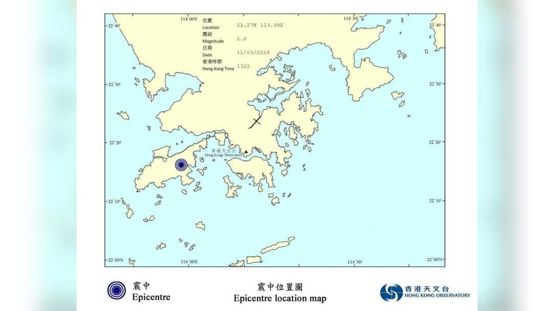 據天文台的初步分析,今日下午1時22分香港大嶼山發生一次2.0級地震,震中位於北緯22.27度,東經113.98度附近,即天文台之西約20公里(即距離香港之西約20公里),震源深度約10公里。
