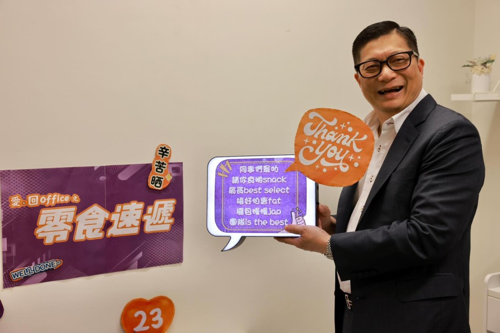 鄧炳強表示,近來無論他「幾早返工,幾夜收工」,辦公室總是燈火通明。他說,他在辦公室和立法會會議室各擺了一個「加油站」,感激大家上下一心,希望讓零食能為同事們補充能量。