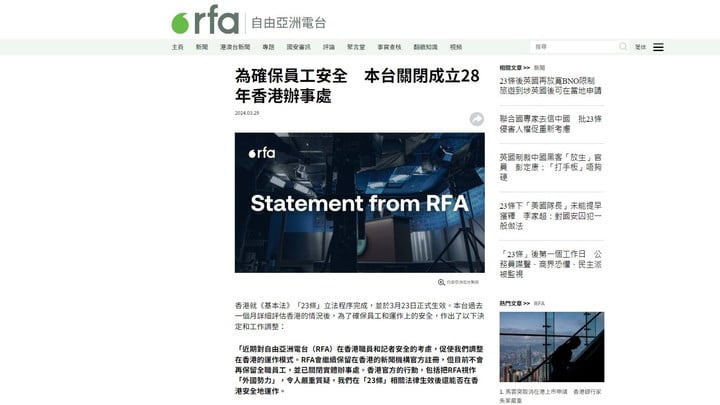 自由亞洲電台宣布,因應《基本法》23條完成立法,決定調整在香港的運作模式,已關閉香港的實體辦事處,不會再保留全職員工,但會繼續保留新聞機構官方註冊。