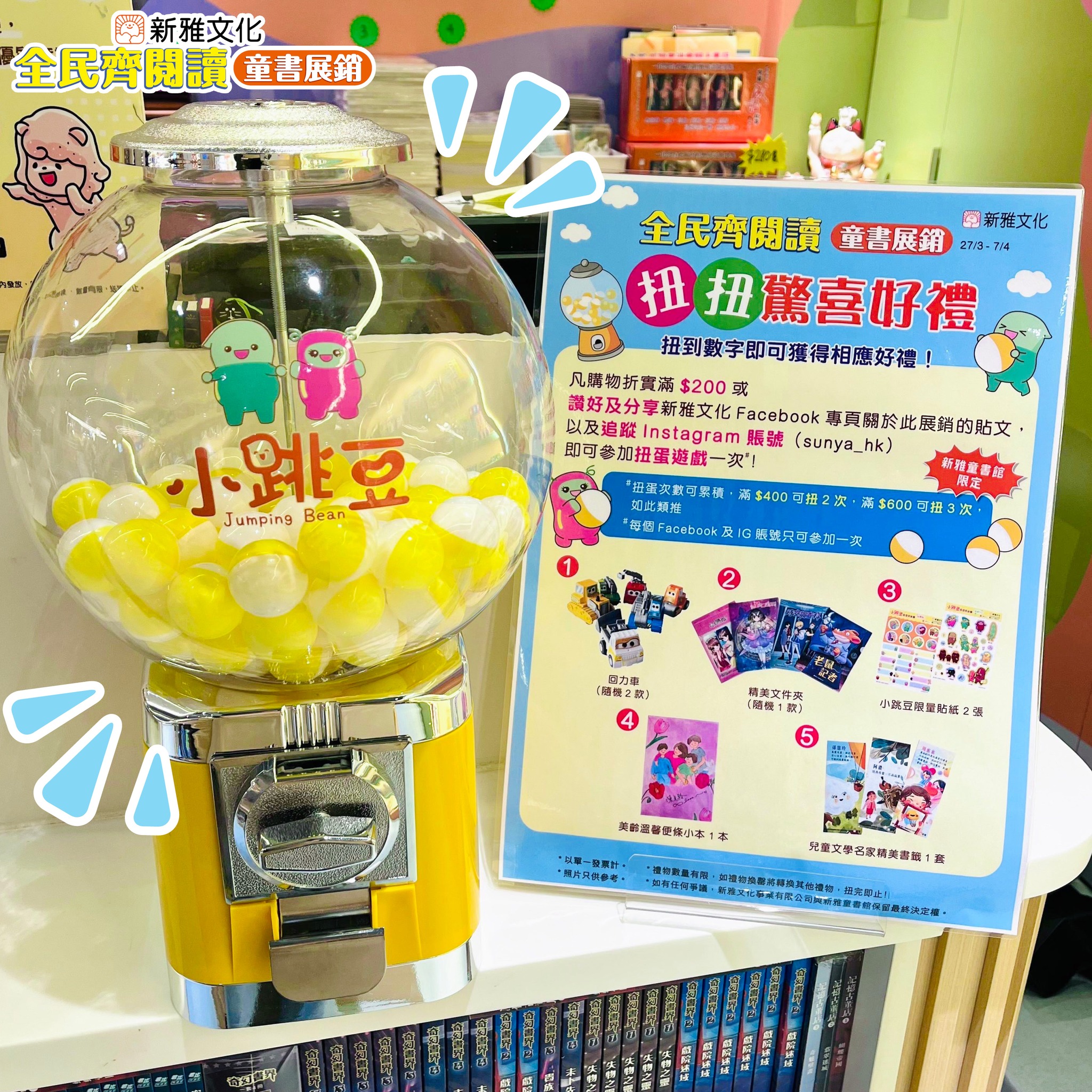 凡購物折實滿$200或讚好及分享新雅文化Facebook專頁關於此次展銷的貼文,以及追蹤Instagram帳號(sunya_hk),即可參加扭蛋遊戲一次!禮物非常豐富,包括:回力車、各款精美文件夾、小跳豆貼紙、陳美齡溫馨便條小本、兒童文學名家精美書籤等,數量有限,送完即止。