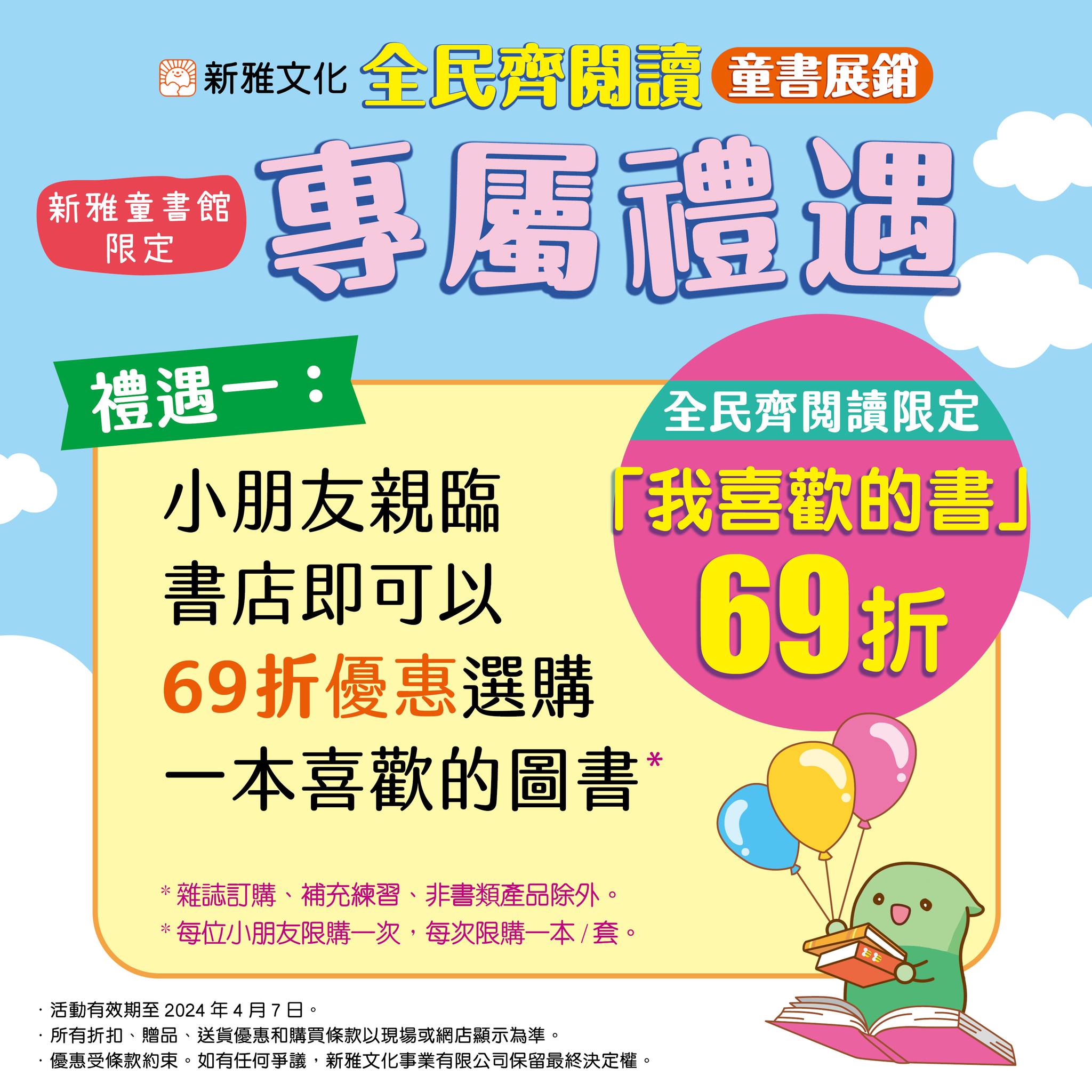 為鼓勵小朋友多閱讀,家長幫小朋友選書之餘,新雅文化非常支持小朋友親自揀選自己喜歡的圖書,所選圖書可享69折優惠!每位小朋友限購一次,每次限購一本/套。雜誌訂購、補充練習、非書類產品除外。