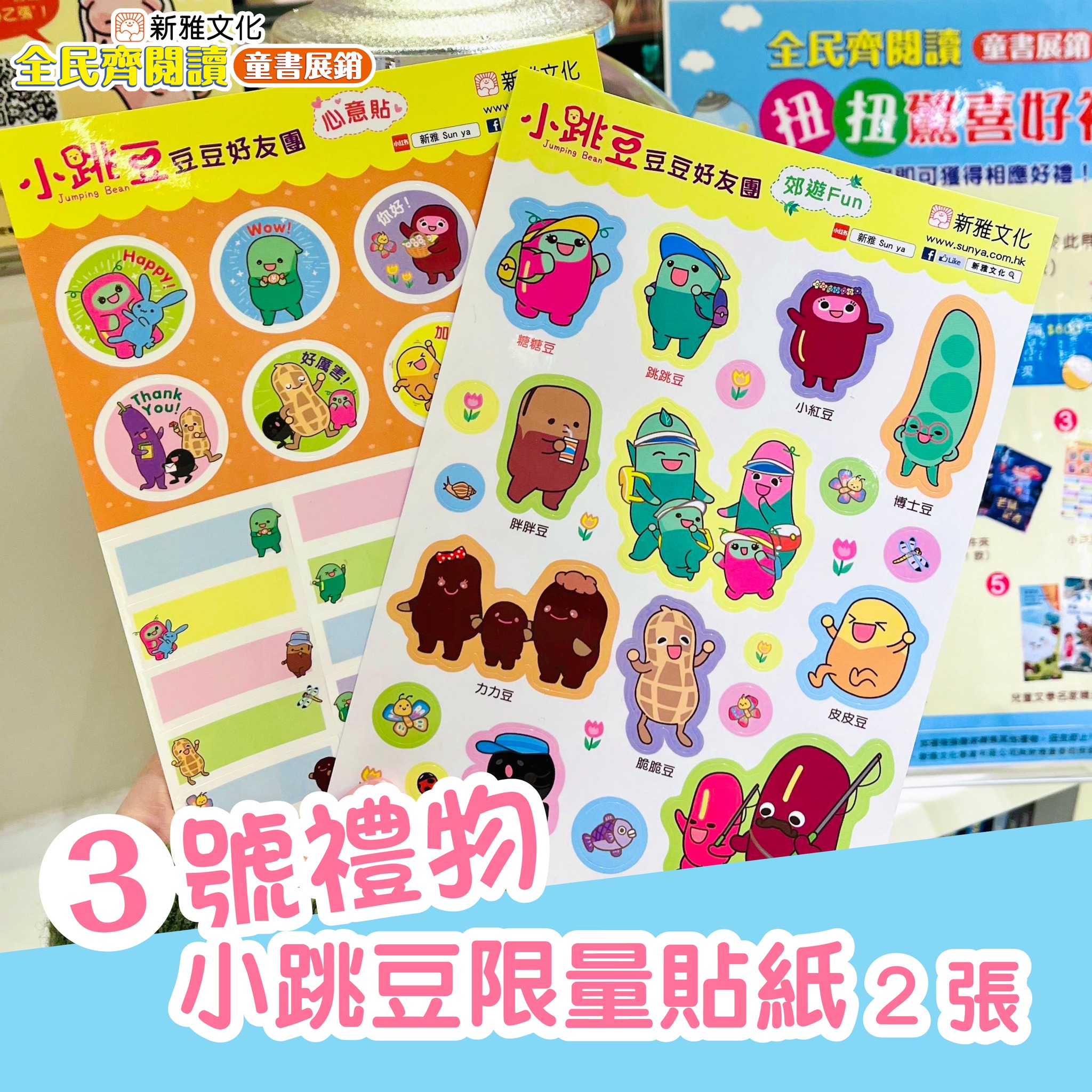有時候家長工作生活皆忙碌,未必有時間與小孩共讀圖書,這時候可以邀請「小跳豆伴讀公仔」!全新四款伴讀公仔,包括:跳跳豆、糖糖豆、小紅豆、脆脆豆,陪小朋友一起看書。顧客購物滿$800,將加贈限量「小跳豆公仔」一個(於指定日期憑換領信到書店換領)。