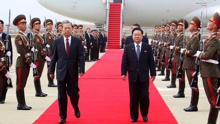 中共中央政治局常委、全國人大委員長趙樂際,率領中國黨政代表團,乘坐專機,抵達北韓首都平壤,展開3日訪問行程。北韓最高人民會議委員長崔龍海到場迎接。雙方隨後舉行會談。趙樂際強調,中國黨和政府高度重視中朝傳統友好合作關係,維護好、鞏固好、發展好中朝關係始終是中國堅定不移的戰略方針;今年是中朝建交75周年。中方願同朝方一道,密切高層交往,深化互利合作,加強戰略協作,推動中朝關係繼續向前發展。