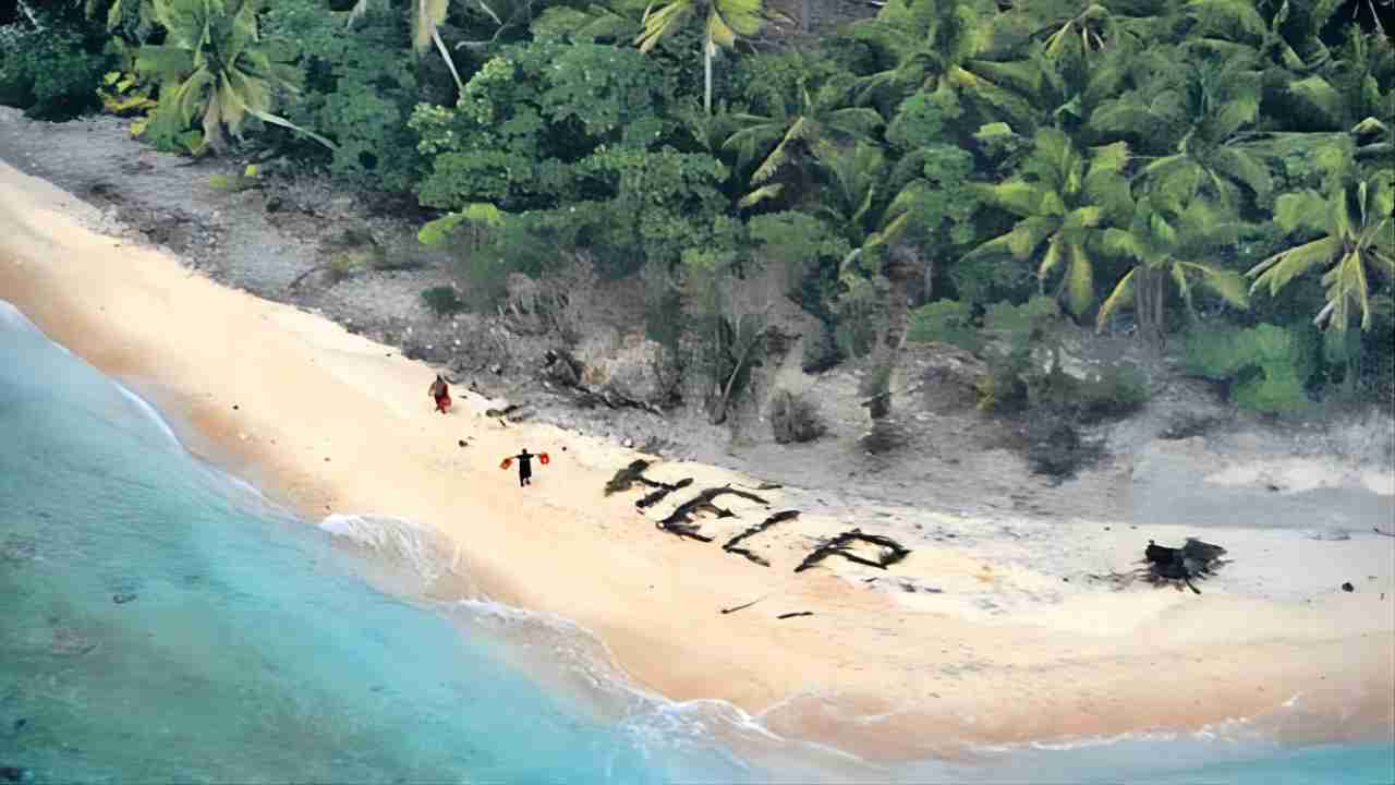 3人爬上無人居住的皮克洛特島,但無線電已經沒電,只能用棕櫚葉在海灘上排列成「HELP」字樣等待救援。