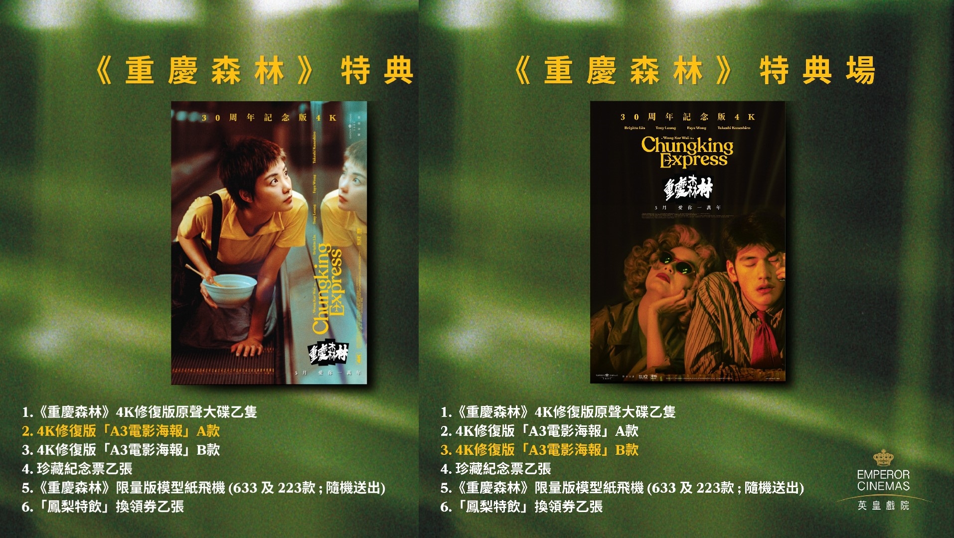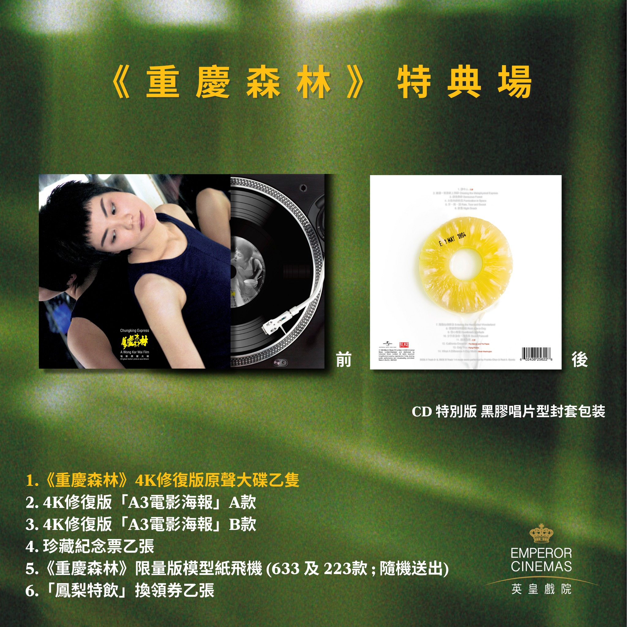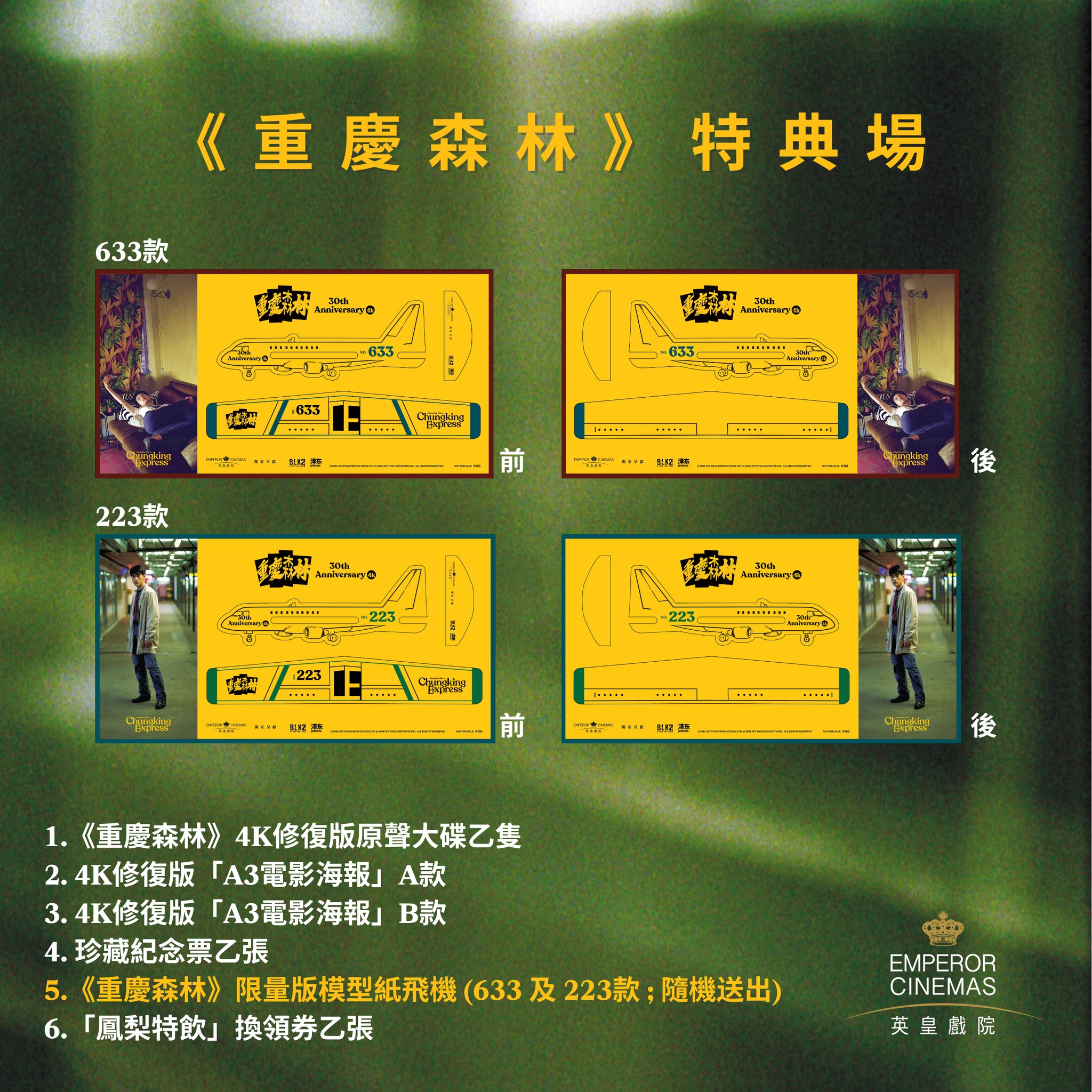 本次《重慶森林》4K修復版將在英皇戲院獨家放映,戲院不負眾望繼續推出特典場,為影迷們準備了多份精美禮品。凡購買《重慶森林》特典場戲票1張,可獲贈「電影特典」乙份,包括《重慶森林》4K修復版原聲大碟乙隻 、4K修復版「A3電影海報」A款 (王菲款)、4K修復版「A3電影海報」B款 (林青霞及金城武款)、珍藏紀念票乙張 、《重慶森林》限量版模型紙飛機 (633及 223款;隨機送出) ,甚至還有不可缺少的「鳯梨特飲」換領券乙張。