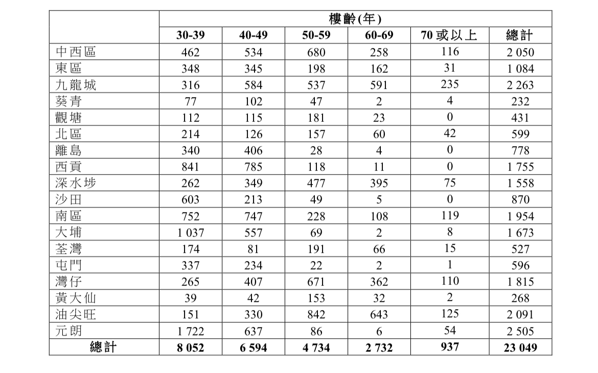 至於樓齡屆50年至69年者,亦有7466幢,油尖旺佔1485幢、九龍城佔1128幢、灣仔佔1033幢。從上面這些數字可見,本港邁向城市老化的嚴重情況。