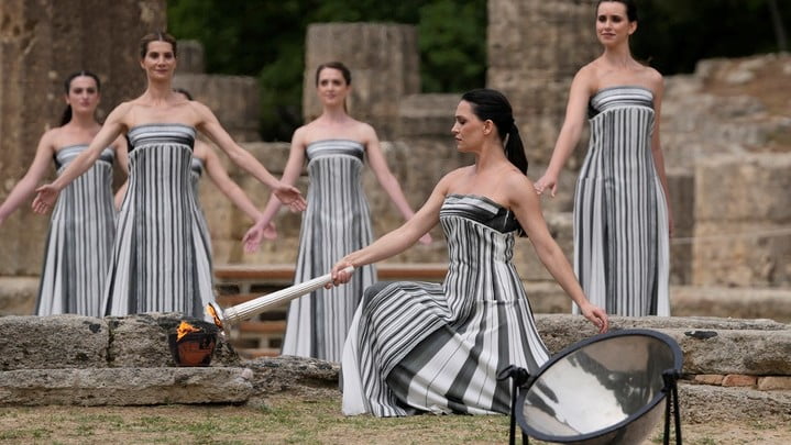 明日是巴黎奧運會開幕倒數100日,奧運聖火火種採集儀式,今日在希臘奧林匹亞遺址的競技場舉行。扮演最高女祭司的演員,原本通過特制的凹透鏡反射陽光,採集聖火,因為天氣關係,改用前一日綵排時的備用火種燃點火炬。