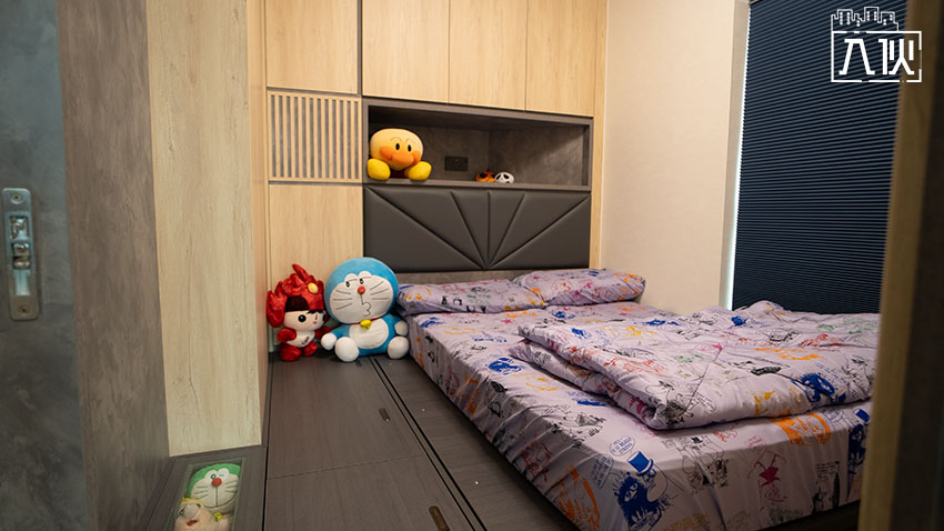 單位原本有兩間房,現時打通為一間大房,分為辦公區域和睡床位置。睡房有窗台,書桌近窗,座位上有吊櫃放書。書桌後方有大個L型到頂衣櫃,令辦公區域等同衣帽間,同時分隔開睡床位置。床下則加高了地台放雜物,部分地台門安裝加厚強化玻璃,展示業主的玩偶。
