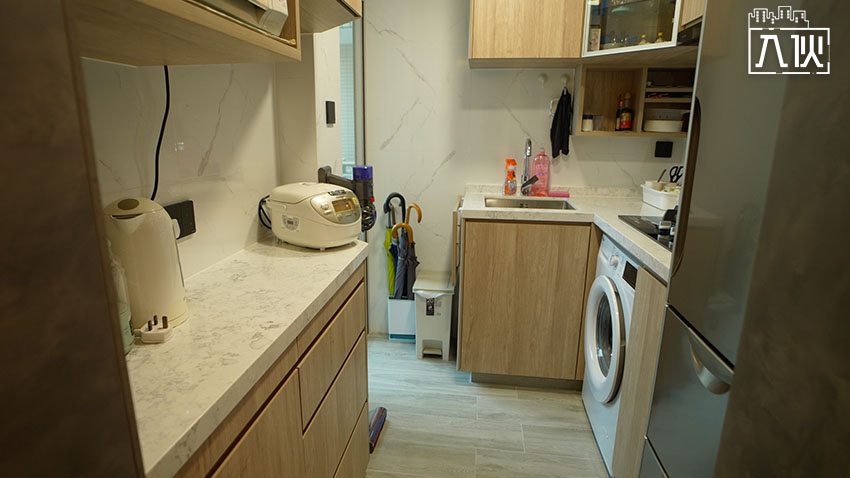 業主重新訂造廚櫃,有三邊工作枱,亦預留位置放微波爐和洗衣機。圖:入伙