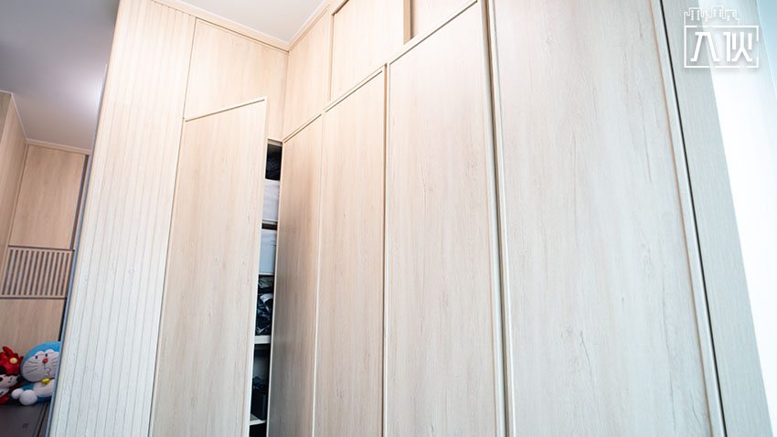 設計師利用L型到頂衣櫃,分隔開辦公區域和睡床位置。圖:入伙