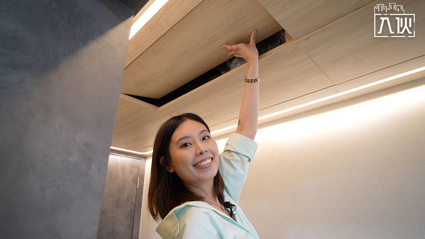 玄關位天花原本有兩條橫樑,設計師沒有浪費,造了一個2.5米乘1.1米的閣仔,用來收納業主的滑雪裝備,再加上滲燈做裝飾,非常特別。