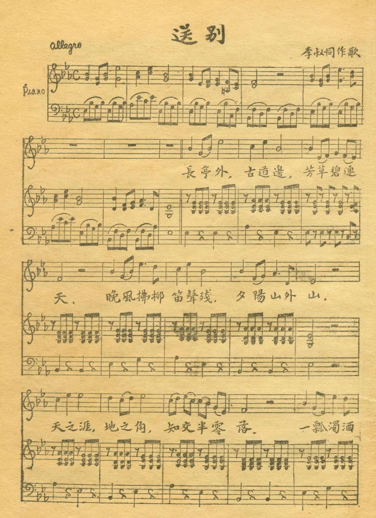 此外,李叔同亦是中國近代著名音樂啟蒙教育家、學堂樂歌的開創者之一。他根據美國作曲家奧德威創作的歌曲旋律填詞的《送別》,百年來一直傳唱不衰。