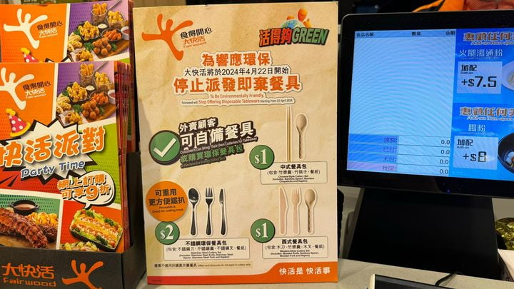 第一階段管制即棄塑膠產品即日起實施,設半年適應期。早上有連鎖快餐店已在收銀處擺出告示,表明外賣顧客若需要餐具,須額外收費,不鏽鋼可重用餐具每包2元,而木刀、木叉、竹筷子和竹漿羹等中式或西式餐具包,每套分別收1元。