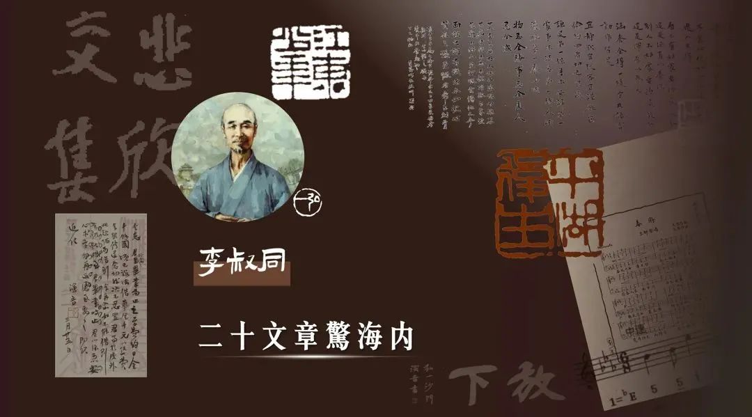 被譽為「二十文章驚海內」的李叔同,也被尊稱為「弘一法師」,在僧俗兩界均享有盛名。他祖籍浙江平湖,作為中國新文化運動的先驅,在詩、詞、書、畫、篆刻、音樂、戲劇等方面均有極高造詣。「長亭外,古道邊,芳草碧連天」這首不少人耳熟能詳的歌曲《送別》正是由李叔同改寫而成。同時李叔同亦培養了漫畫家豐子愷、音樂家劉質平、國畫大師潘天壽等國寶級藝術家。