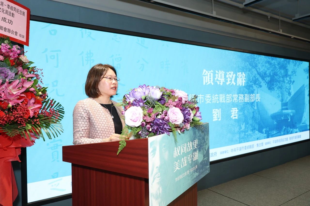 嘉興市委統戰部常務副部長劉君在致辭中表示,舉辦「叔同故里 美哉平湖」李叔同紀念展暨平湖文化周活動是平湖主動推動優秀文化走出去的一次積極嘗試。她希望,可以吸引更多香港朋友前來細品李叔同展帶來的中華藝術底蘊和文化魅力,歡迎大家到叔同故里——嘉興、平湖來考察訪問,感受人文薈萃、美景如畫的魅力嘉興。