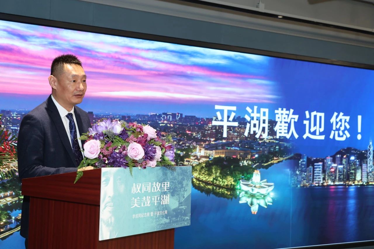 平湖市委常委、統戰部部長沈志林在致辭中介紹李叔同對故里平湖的深情厚意,並從歷史文化底蘊深厚、經濟優質開放包容、全域秀美共富宜居、區位優越潛力無限四方面推介平湖城市。他指出:「李叔同『勇猛精進』的人格精神,激勵著新時代平湖人在『大有可為』的新時代裡『大有作為』」。
