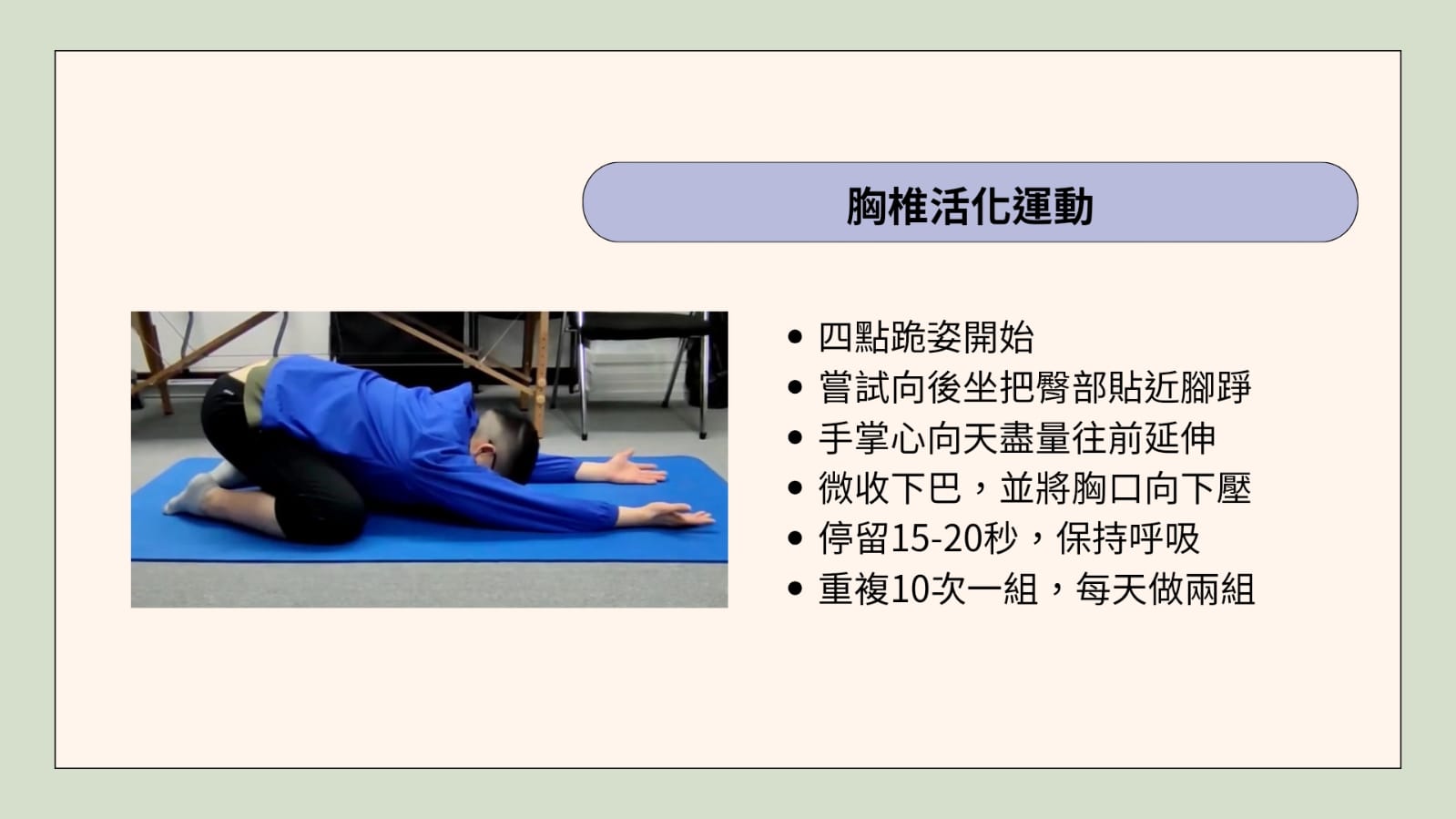 讀者可嘗試以上運動能否改善胸椎過緊的問題,但如果問題持續或有任何異常情況,請尋求家庭醫生或物理治療師專業意見。