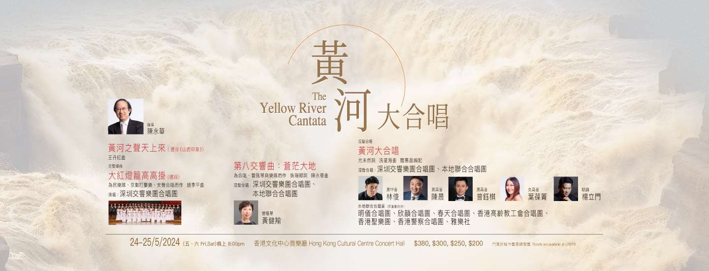 2024年5月24日至5月25日,香港中樂團將攜手深圳交響樂團合唱團獻上節目「黃河大合唱」。香港著名指揮家與作曲家陳永華將聯同港深兩地200多人龐大合唱團攜手演繹其代表作、曾獲香港作曲家及作詞家協會金帆獎的《第八交響曲:蒼茫大地》,為觀眾帶來著名作曲家王丹紅的《黃河之聲天上來》(選自《山西印象》),並與深圳交響樂團合唱團演出國際著名作曲家趙季平的交響組曲《大紅燈籠高高掛》(選段);及冼星海作曲、光未然作詞及閻惠昌編配、被譽為「20世紀華人音樂經典」的著名聲樂作品《黃河大合唱》,呈獻優美的旋律及雄偉悲壯的歌聲。