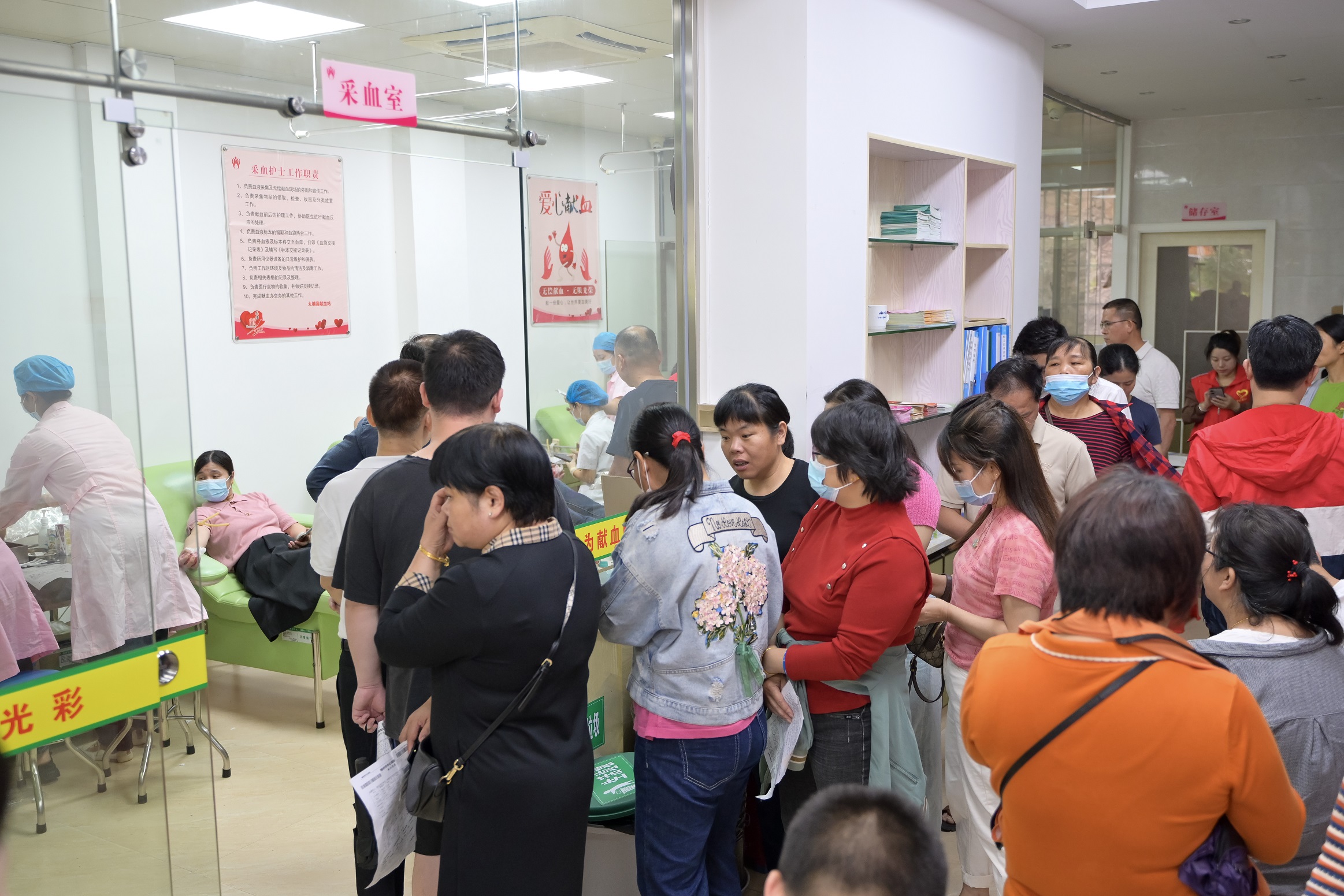 梅州市大埔縣獻血站,市民排隊為傷員獻血。