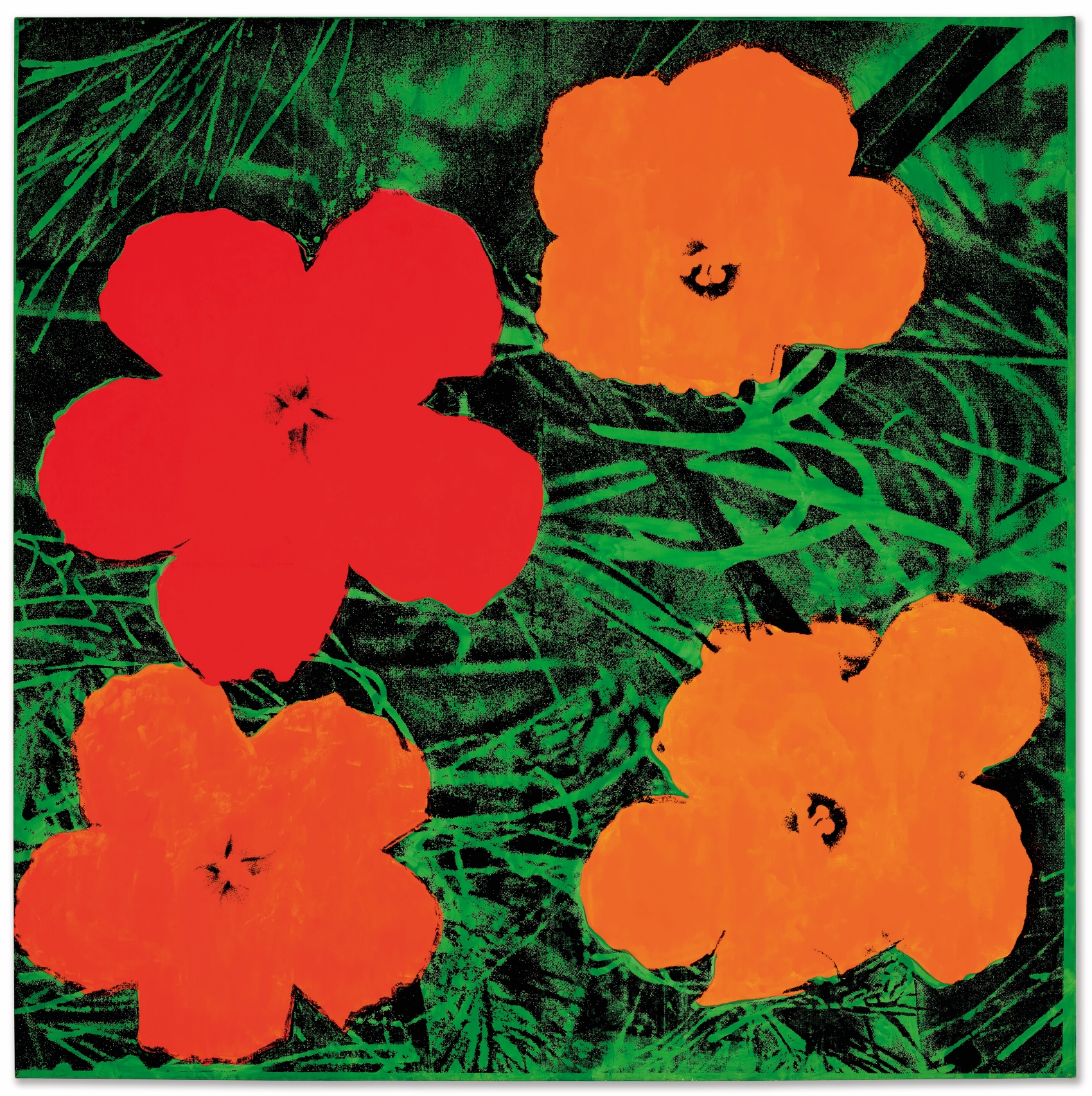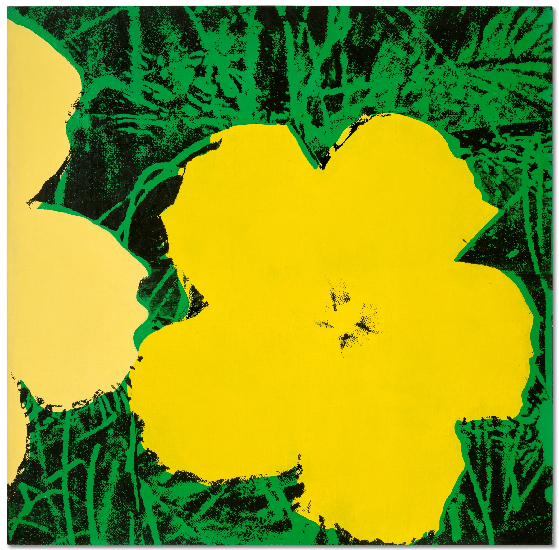 根據記載,沃荷畢生僅創作了12幅尺寸達82英寸的《花》系列畫作,而本作便為當中之一。而其一朵半花的構圖,更是同尺幅中絕無僅有的力作。本作完成的1965年,亦是沃荷藝術生涯的關鍵時期——當時的「沃荷狂熱」一度成為了美國文化時代思潮。本作品是沃荷現存《花》系列作品中唯一描繪一朵半木槿花的82英寸尺幅之作。其他11幅同尺幅作品畫面上均以四朵花為構圖。此外,本幅傑作中的花朵和綠色背景均為沃荷親手繪製,為表面注入了細緻入微的紋理和厚塗效果,與絲網印刷的機械複製性質形成了非一般的張力。