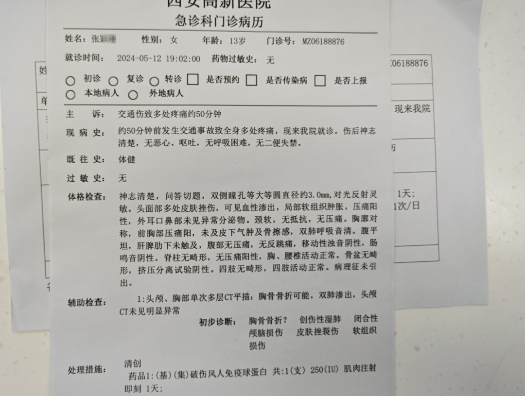 家屬出示的西安高新醫院門診科病歷顯示,傷者張某某因交通傷致多處疼痛,輔助檢查結果顯示胸骨可能存在骨折,雙肺滲出。醫院記錄顯示,傷者張某某當晚7時02分就診。