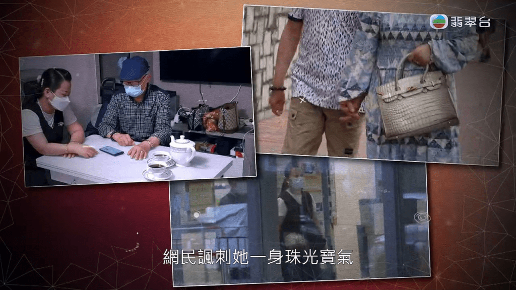 昨晚《東張西望》再派出「東張女神」梁敏巧去訪問何伯及新何太,曾高調在節目上曬13萬兩卡鑽戒、逾10萬勞力士名錶,及Hermès天價喜馬拉雅Birkin手袋的新何太,在最新一集入面繼續曬私伙,戴住之前未出過鏡的一金一銀手鐲見人,訪問期間更跟何伯表現親暱,不時互摸大髀。對於被網民指炫富,新何太在節目上就一邊曬手袋,一邊解釋之前用的天價手袋其實是在內地直播購買的「A貨」:「啲老闆自己有皮具廠,自己直播帶貨。」另外其他手袋都是幾百港元的普通牌子。