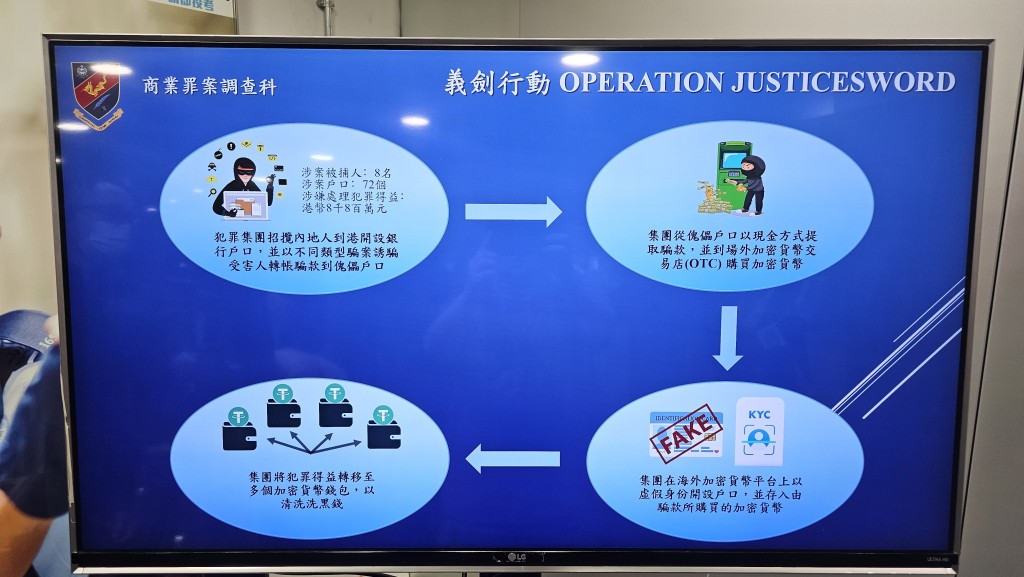 鍾卓賢指,受害人根據騙徒指示,將騙款存入犯罪集團控制的傀儡戶口,之後集團會從傀儡戶口以現金方式提取騙款,並到加密貨幣場外交易所(OTC)購買加密貨幣,同時又會在海外加密貨幣平台上以虛假身份開設戶口,並存入由騙款所購買的加密貨幣,再轉移至多個加密貨幣錢包,以清洗犯罪得益。