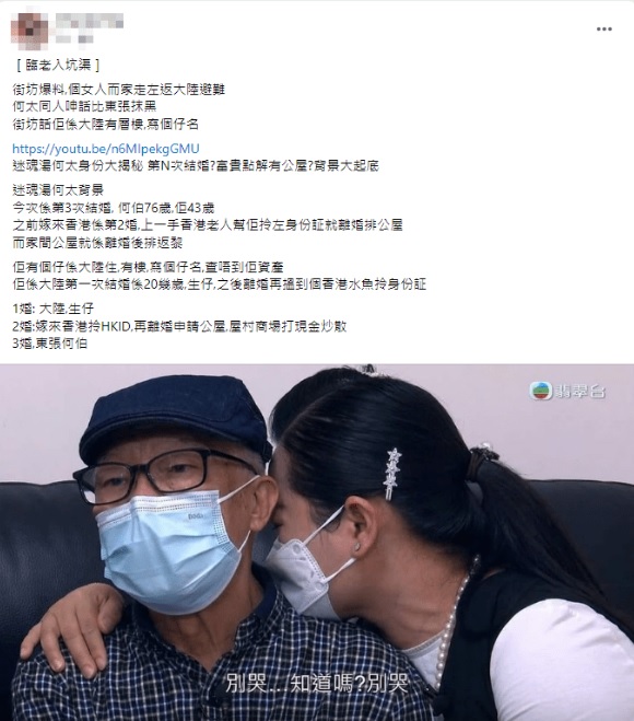 【橙訊】TVB節目《東張西望》上周訪問何伯夫婦引爆全城熱話,更引發網民「洗板式」討論。節目昨晚繼續派出梁敏巧拜會何伯跟何太,又訪問街坊,令事件持續成為全城熱話。在節目中,何伯堅稱450萬是他賺的,又指對子女多年供書教學,卻得到子女如此對待感心痛,更說:「我帶錯咗佢哋嚟呢個世界。」今日何伯疑似大仔於Facebook群組「何伯&何伯老婆關注組」發聲,斥父親神智不清。