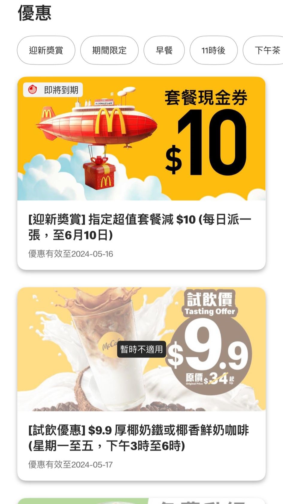 優惠版面有分類(圖:麥當勞App屏幕截圖)