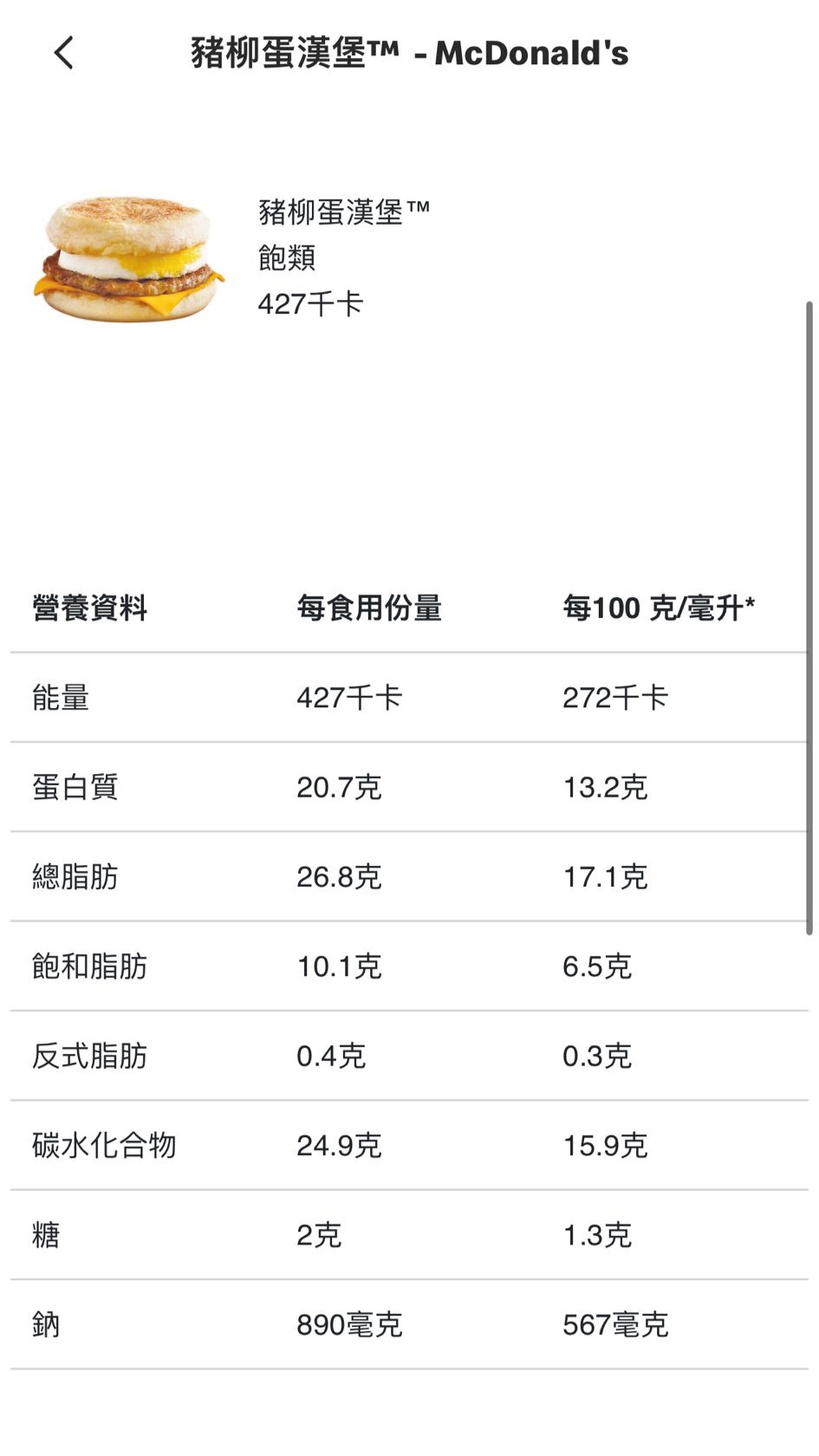 營養資料齊全(圖:麥當勞App屏幕截圖)