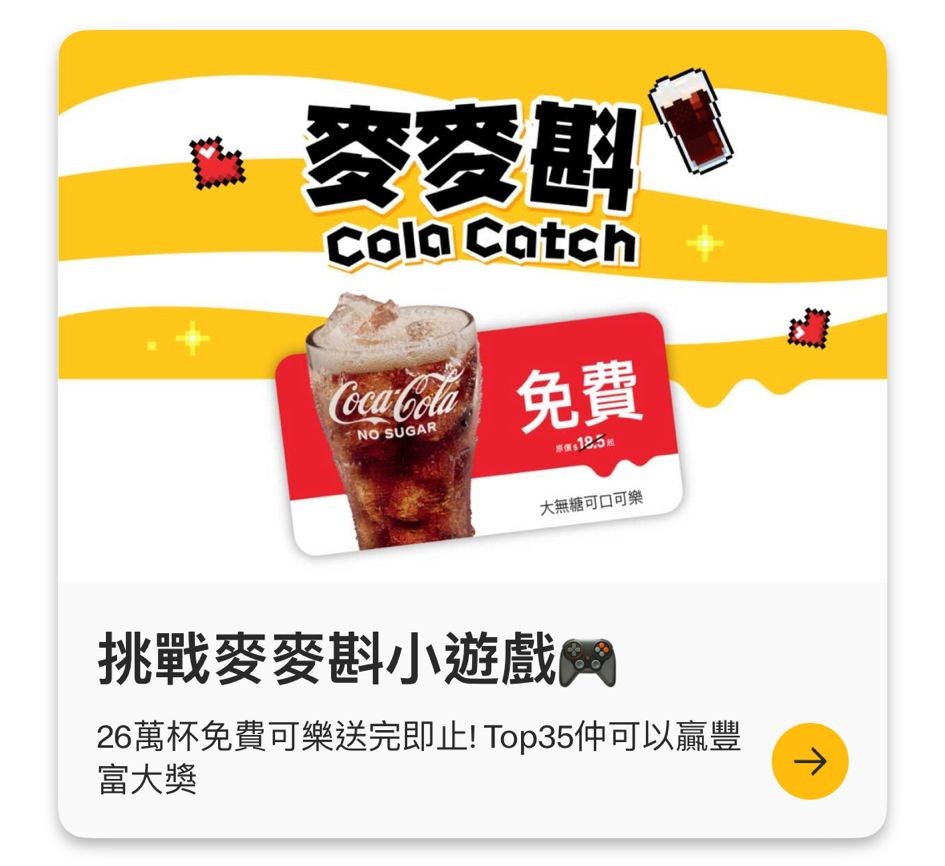 新版App推出「麥麥斟」小遊戲,26萬杯免費可樂送完即止,分數最高的首35名玩家更有機會贏取豐富大獎!