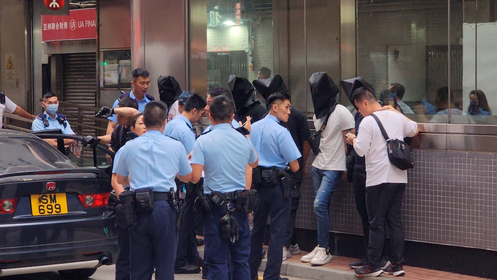 警方在荔枝角截查可疑私家車,制服五名男子(蒙頭者)。