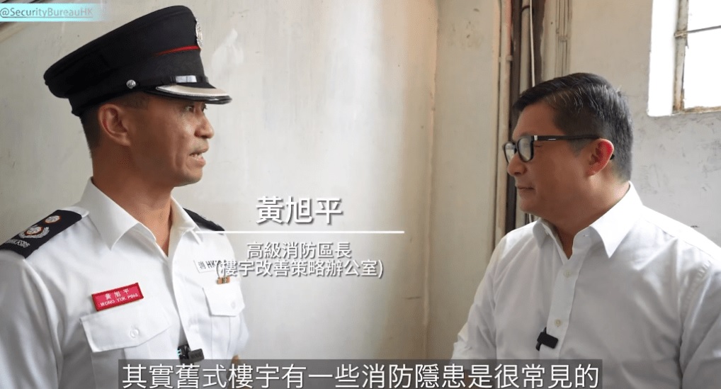 影片所見,鄧炳強與消防處樓宇改善策略辦公室區長黃旭平巡視舊樓,找出四大安全隱患,當中包括第一、巿民把雜物放在逃生通道,當火警發生時便會阻礙逃生;第二是消防設備、裝置過期或欠缺保養,甚至損壞,不能操作;第三則是防煙門長期被打開,失去防煙作用;第四則是天台門被鎖上,令火警發生時無處逃生。