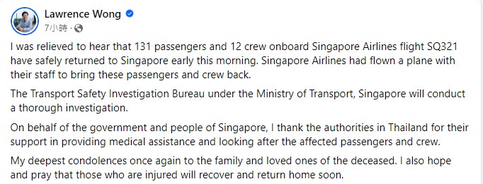 新加坡總理黃循才在社交媒體上表示交通局會徹底調查這次的事故。