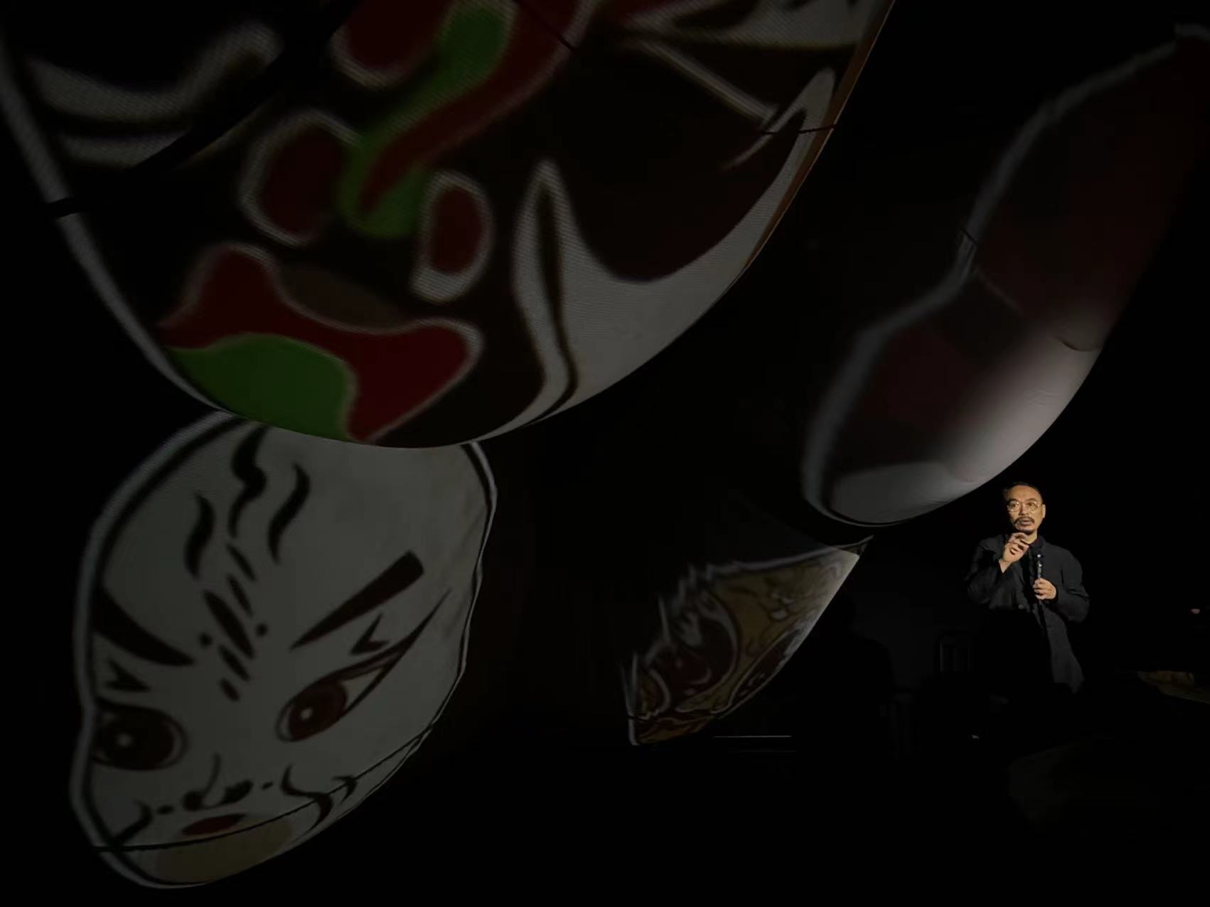 此次節目於5月17日至6月9日演出,共有四段折子戲、一段南音、三個節目組合,每周登場。小編有幸前往首場觀演,起初最感驚艷的部分,便是開場前離觀眾極近的立體帳幕。帳幕上有不少面譜,隨著音效和燈光轉換顏色,猶如數碼版變臉。「我們想讓觀眾一進來不會平視劇場,打開後空間就會有對比,這樣觀眾也能有一個沉浸式的體驗」,胡恩威說。