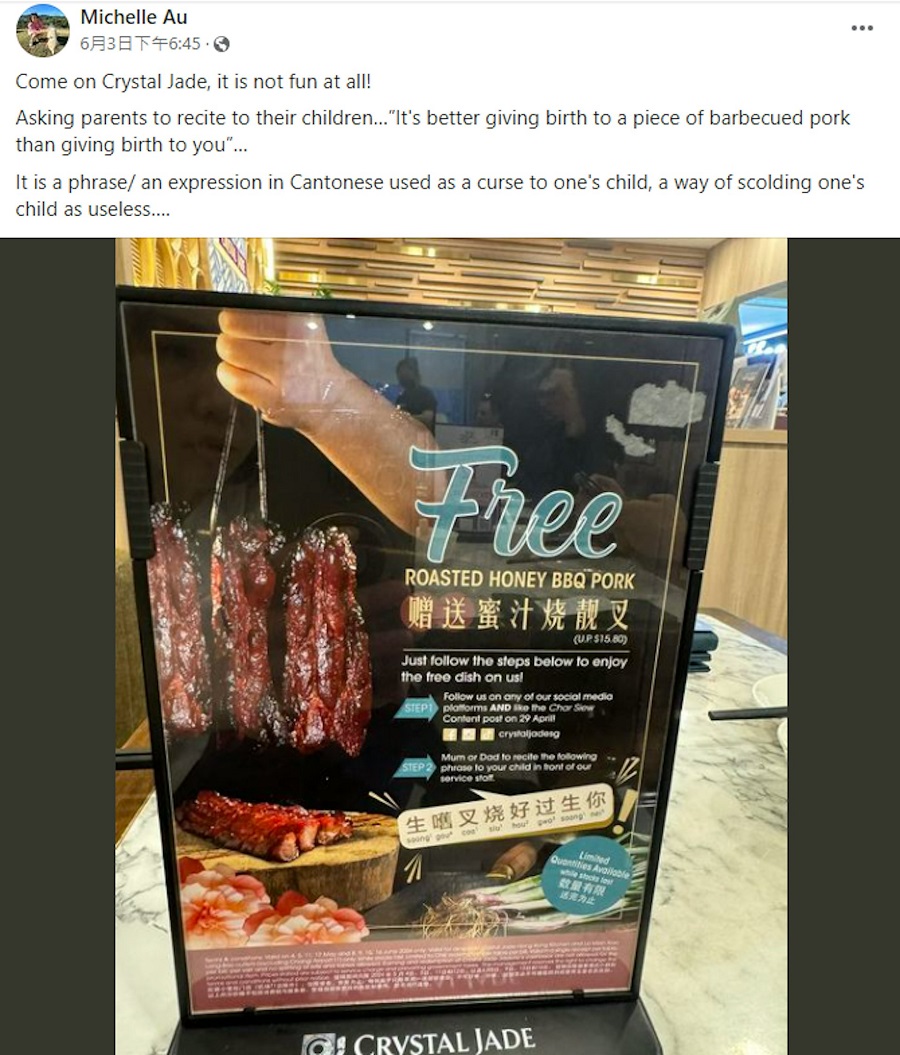 經營餐廳的翡翠集團早前為父親節和母親節造勢,特意推出新的促銷活動,只要父母在櫃枱前對孩子說一句「生嚿叉燒好過生你」就能得到一份價值15.8新加坡元(約91港元)的叉燒,但此舉卻引起公眾的批評和不快。
