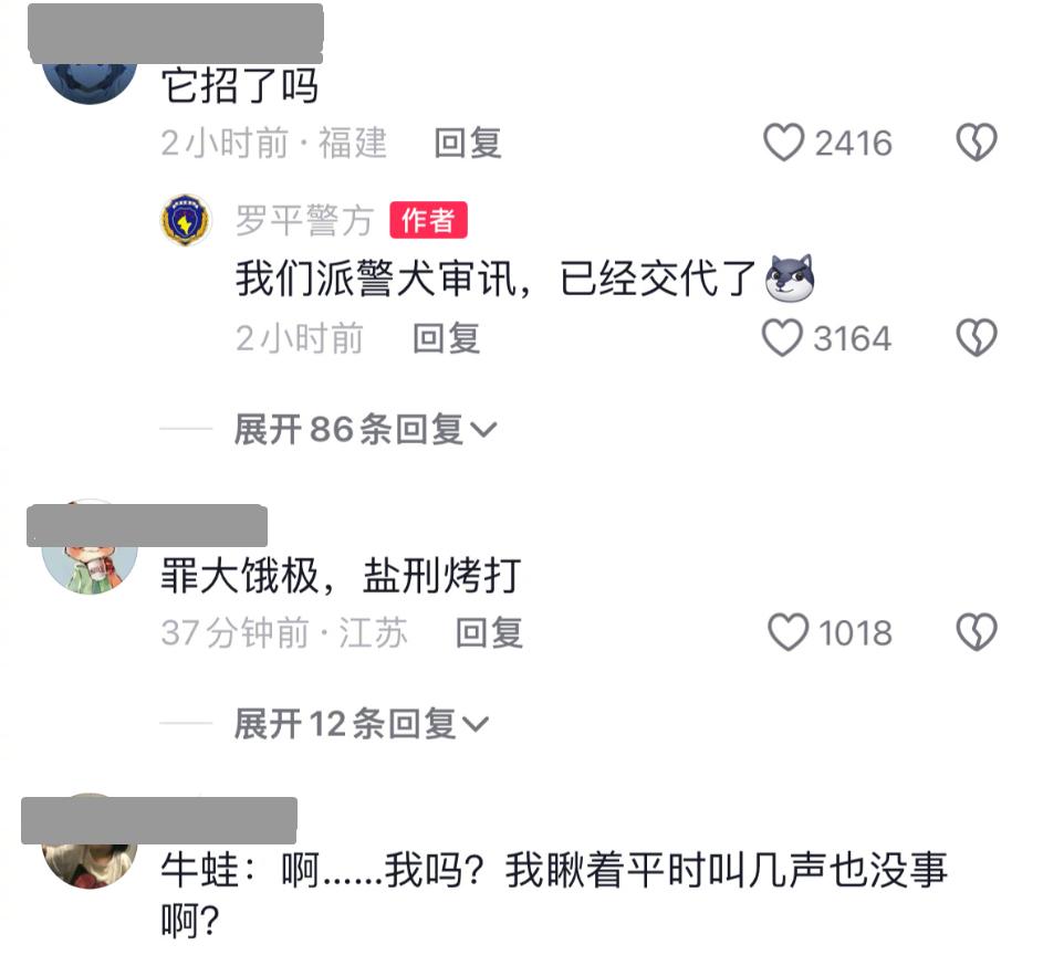 如何處置「嫌疑蛙」成為網友關心的問題,有網友留言問:「招了嗎?」對此,警方回覆:「派警犬審訊,已經交代了。」