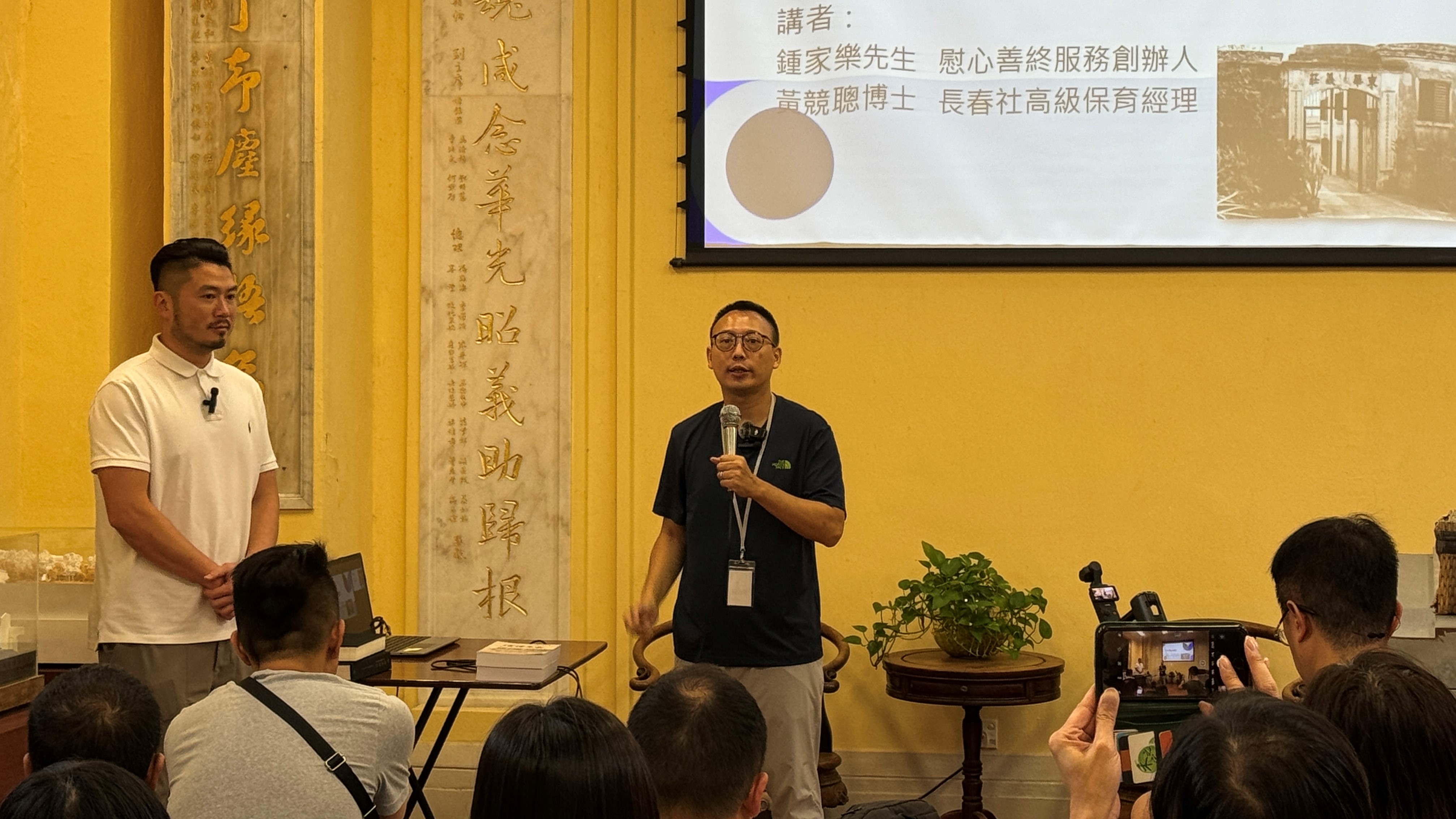 黃競聰博士和鍾家樂先生正在介紹本地華人殯葬的文化。