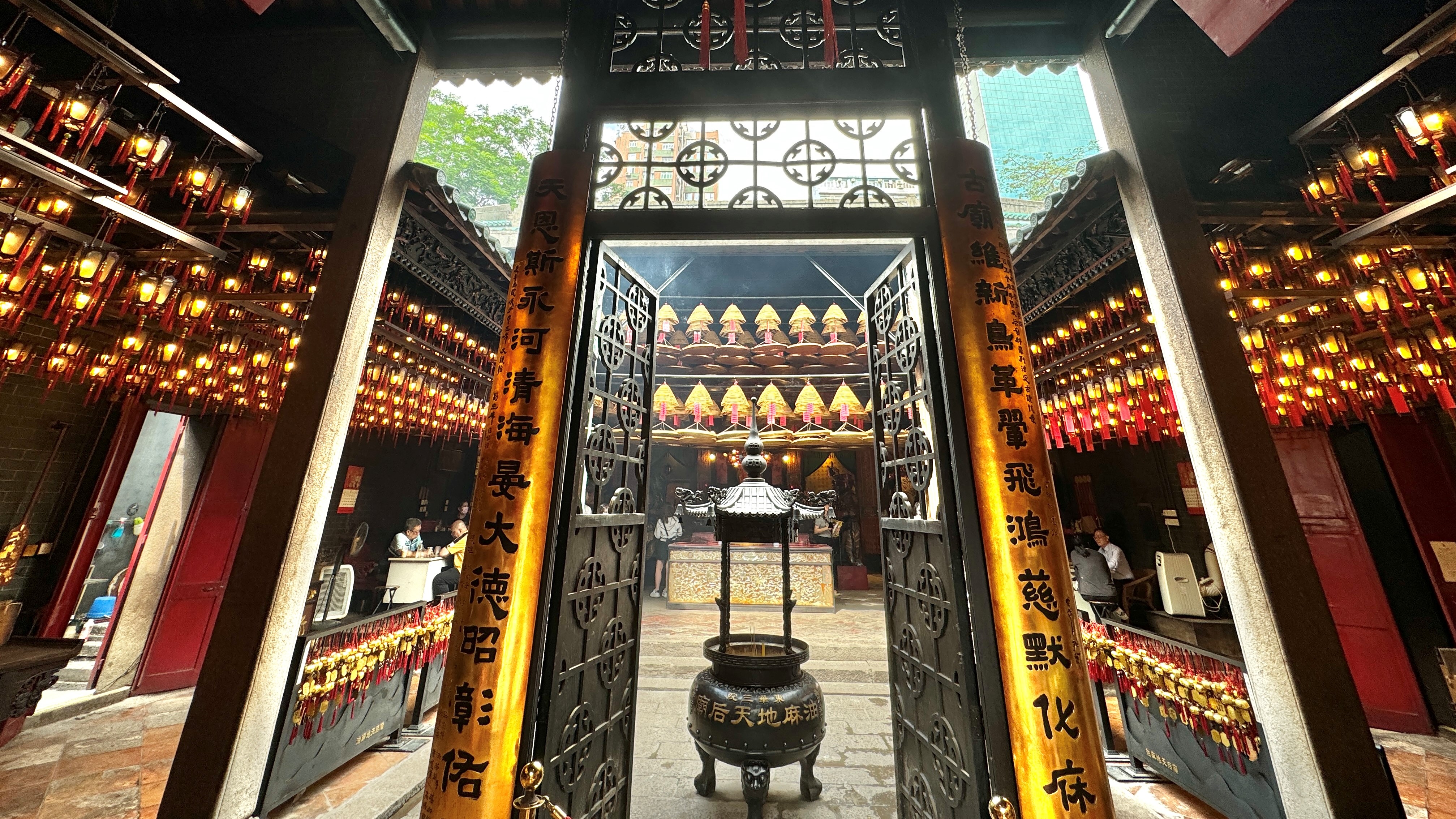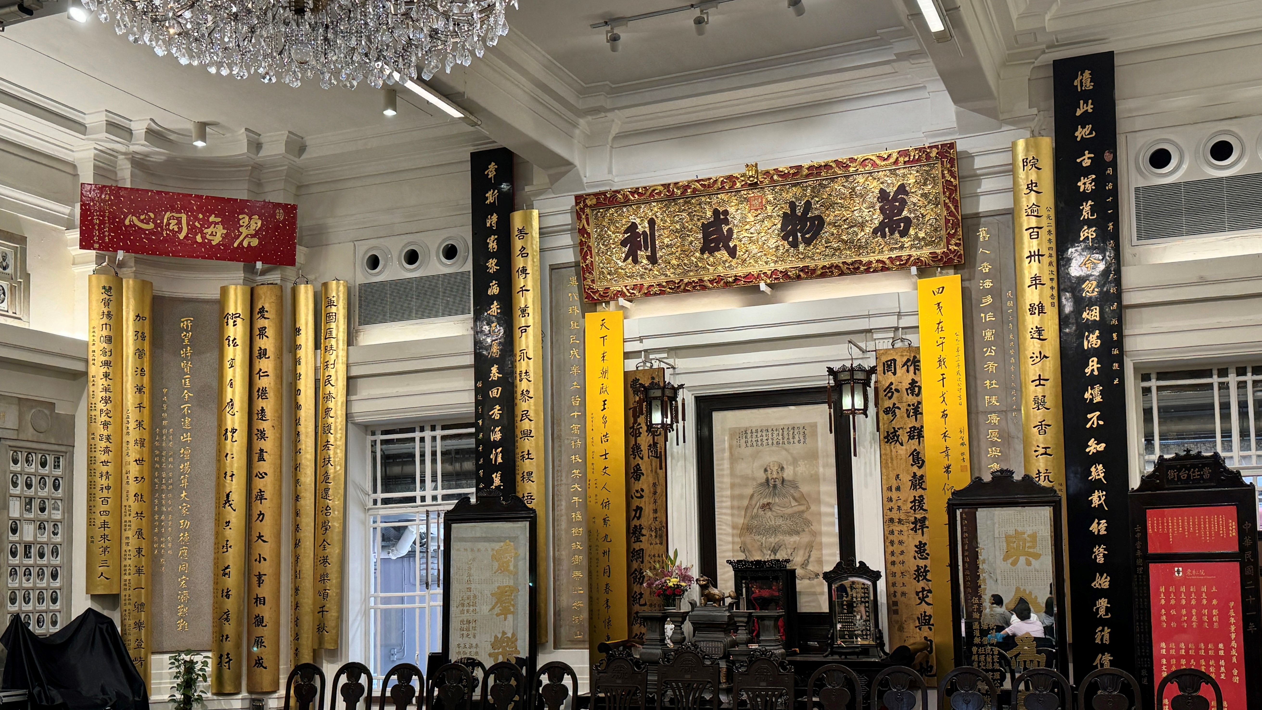 東華三院李兆忠大堂掛滿對聯,古色古香,現時為一級歷史建築。