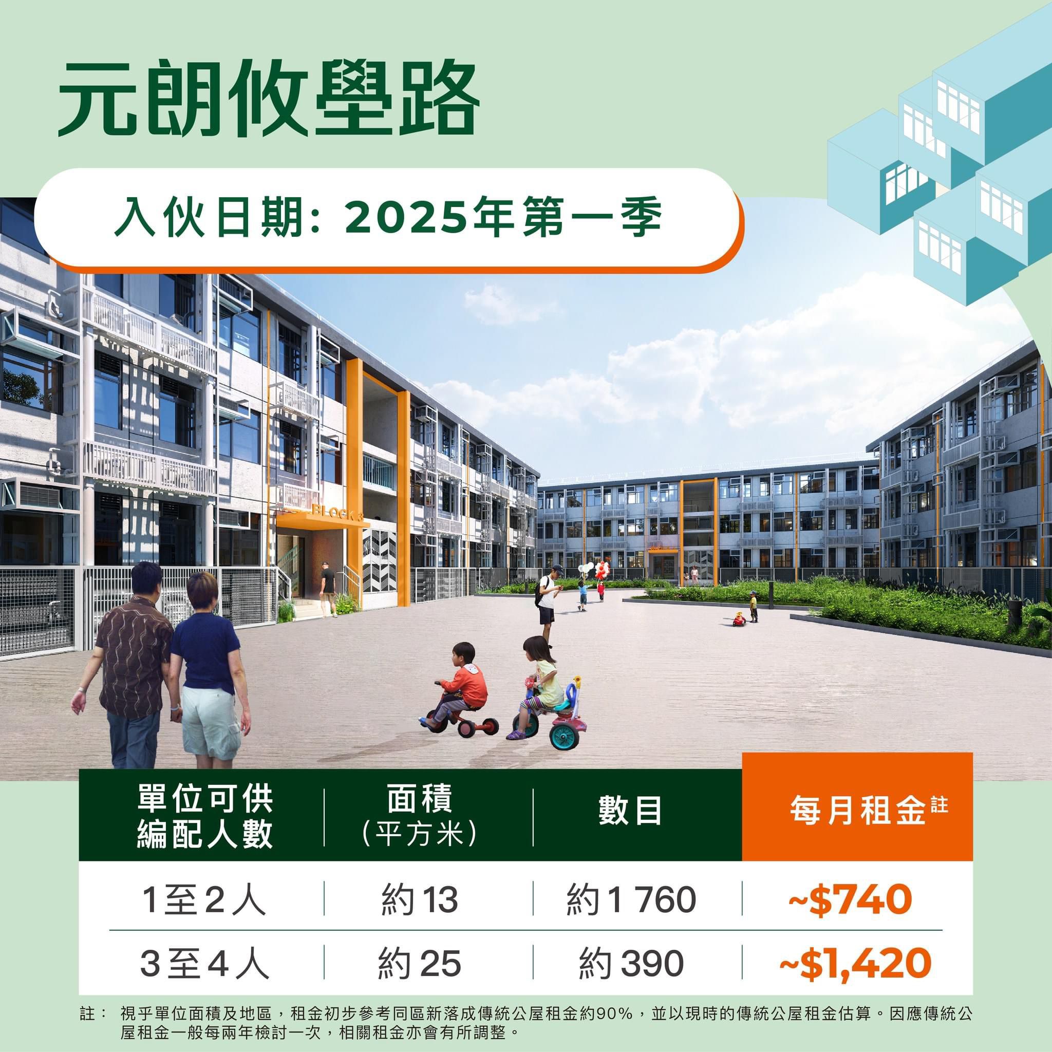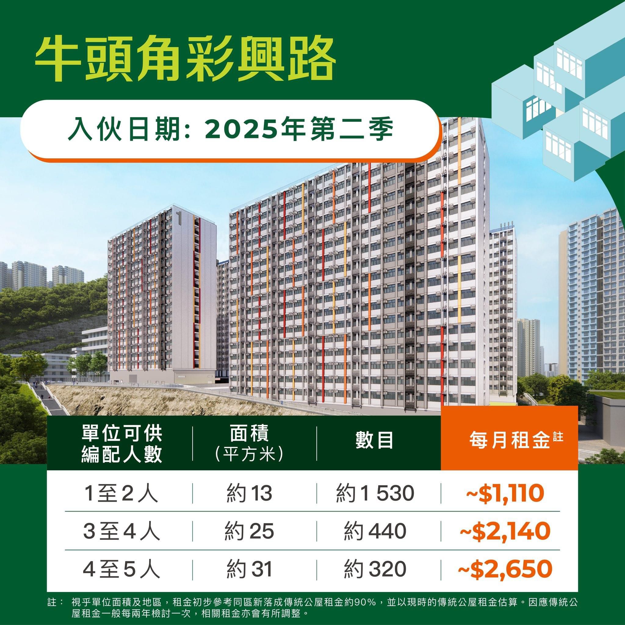 至於價格方面,元朗攸壆路項目的一至二人單位每個月租金是約740港元,三至四人單位租金是約1,420港元。而牛頭角彩興路項目的一至二人單位租金為約1,110港元,三至四人單位的租金為約2,140港元,至於四至五人單位的租金為約2,650元。