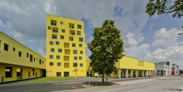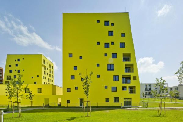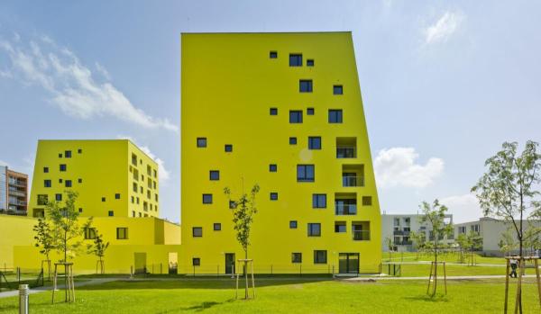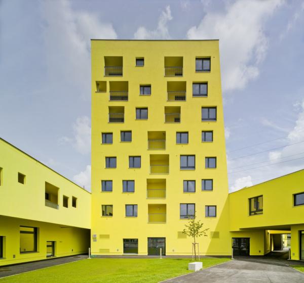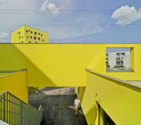 外墻的鮮黃色與天空以及周遭樹木的顏色反差鮮明,這種刻意為之的跳脫感,既增加了建築本身的實驗性,也令到身處其中的住戶獲得視覺上的愉悅感。