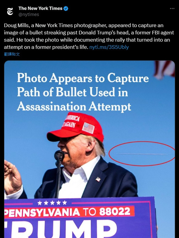 【橙訊】美國前總統特朗普出席賓夕法尼亞州的競選集會時遭槍擊,他右耳受傷流血,槍手當時連開8槍。《紐約時報》(The New York Times)資深攝影記者米爾斯(Doug Mills)當時似乎拍攝到子彈射向特朗普方向,一條彈道清晰可見。