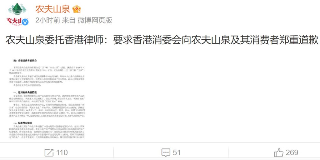 農夫山泉正告消委會立即作出澄清、道歉並消除影響,否則,農夫山泉將採取進一步行動。