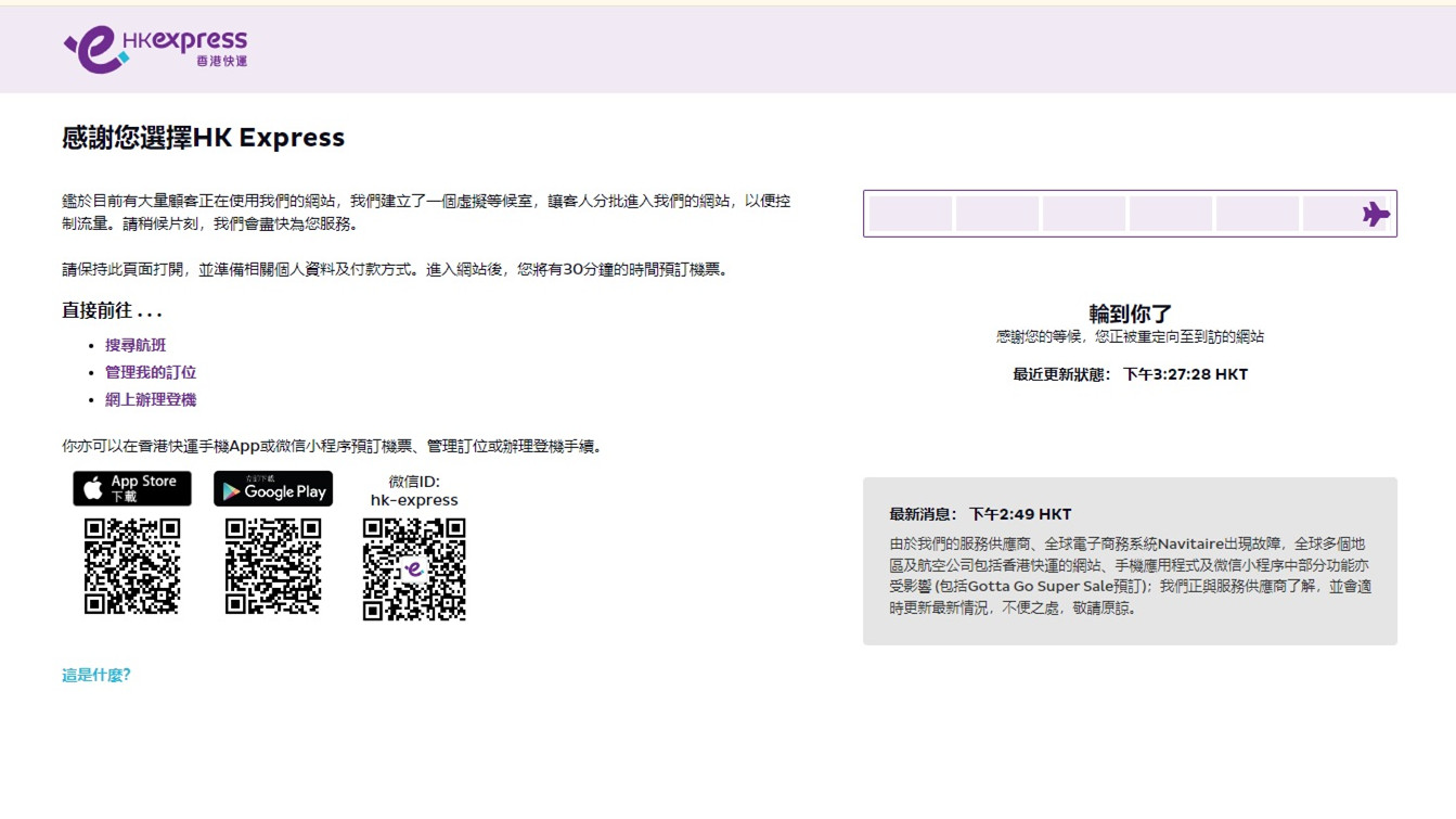 香港快運公布因服務供應商出現故障,公司網站、手機應用程式等的功能受到影響。