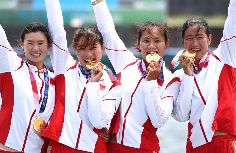 2021年7月28日,在東京奧運會賽艇項目女子四人雙槳決賽中,中國隊選手陳雲霞、張靈、呂揚、崔曉桐(從左至右)奪得冠軍。